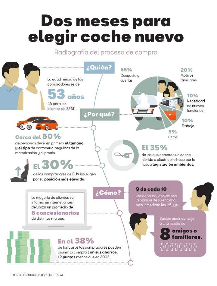 Tiene 53 años, le gustan los SUV y tarda dos meses en cerrar la compra. Según un estudio del departamento de investigación de Mercados de SEAT, éste es el perfil típico de los nuevos clientes del sector de la automoción en Europa. Aunque en el caso de SEAT la edad media de sus compradores baja hasta los 44 años. Pero, ¿qué nos lleva a comprar un coche? ¿Qué características consideramos prioritarias? Esta es la radiografía del proceso que siguen los compradores hasta tomar la decisión final.
