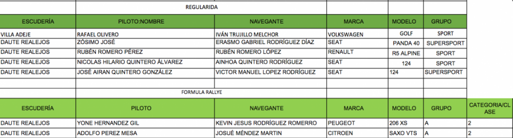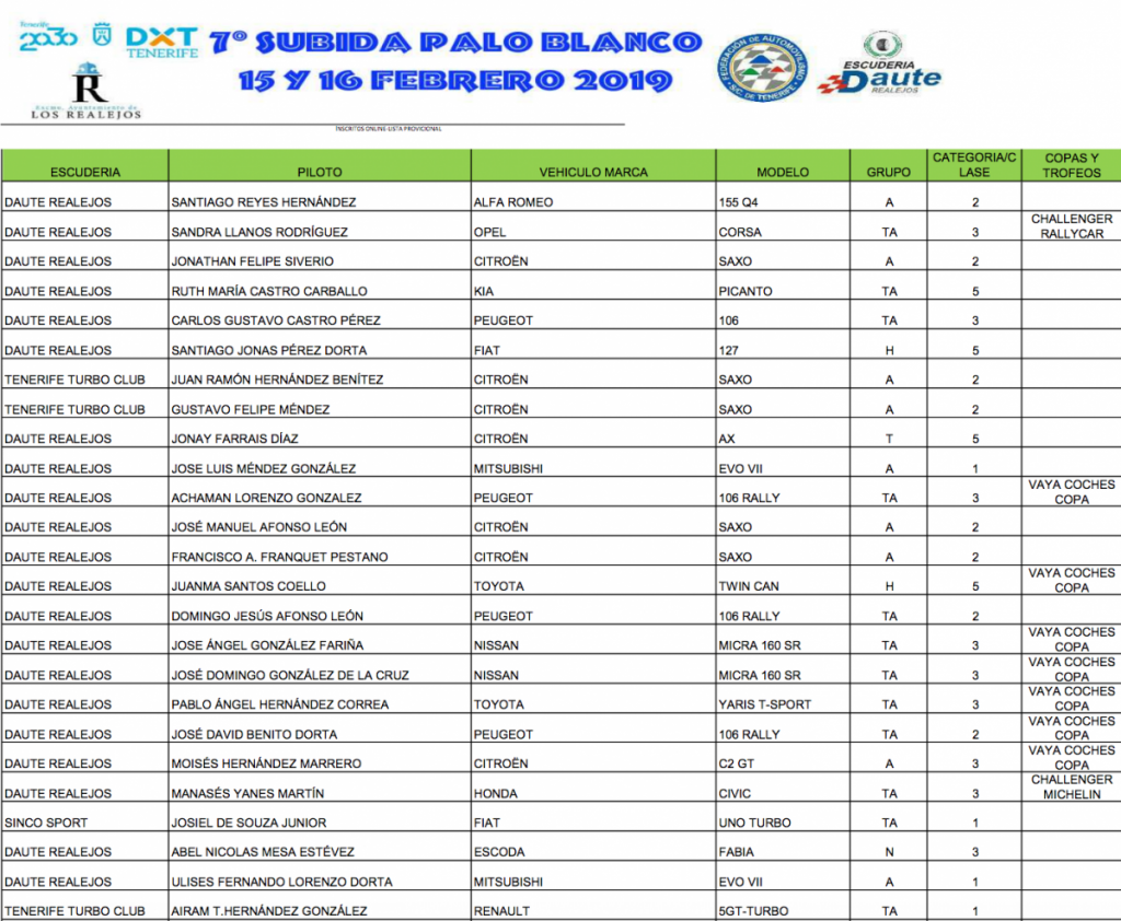 La Escudería Daute Realejos ha publicado, una vez cerrado el plazo de inscripción para VII Subida a Palo Blanco, la lista de inscritos provisional. El próximo miércoles se publicará la definitiva.