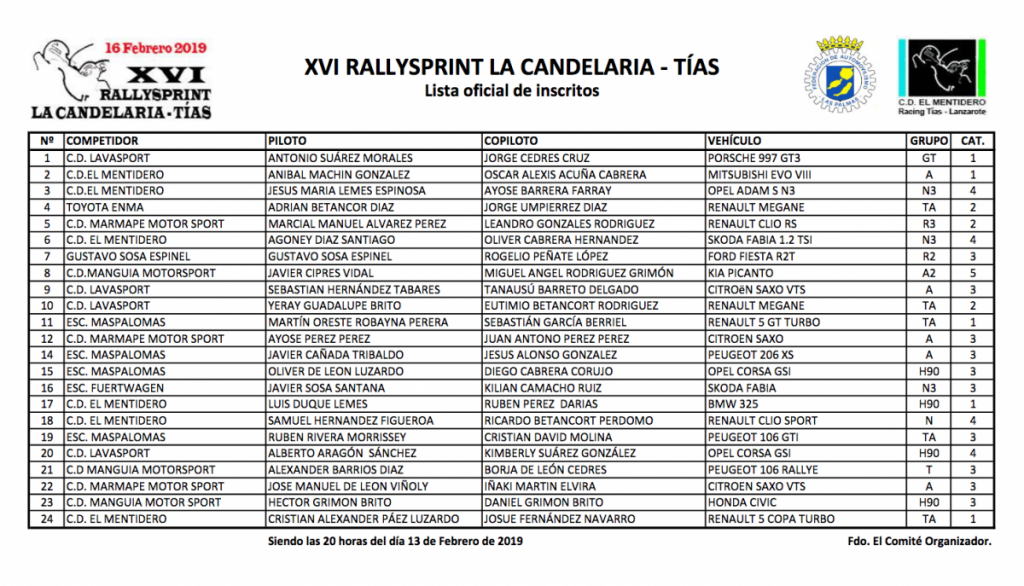 Publicamos la lista oficial de inscritos del XVI Rallysprint La Candelaria-Tías, cita del Campeonato Insular de Lanzarote 2019.