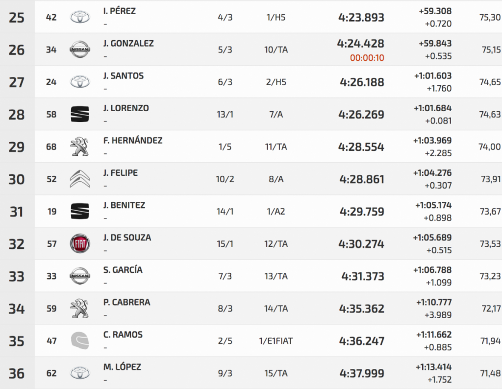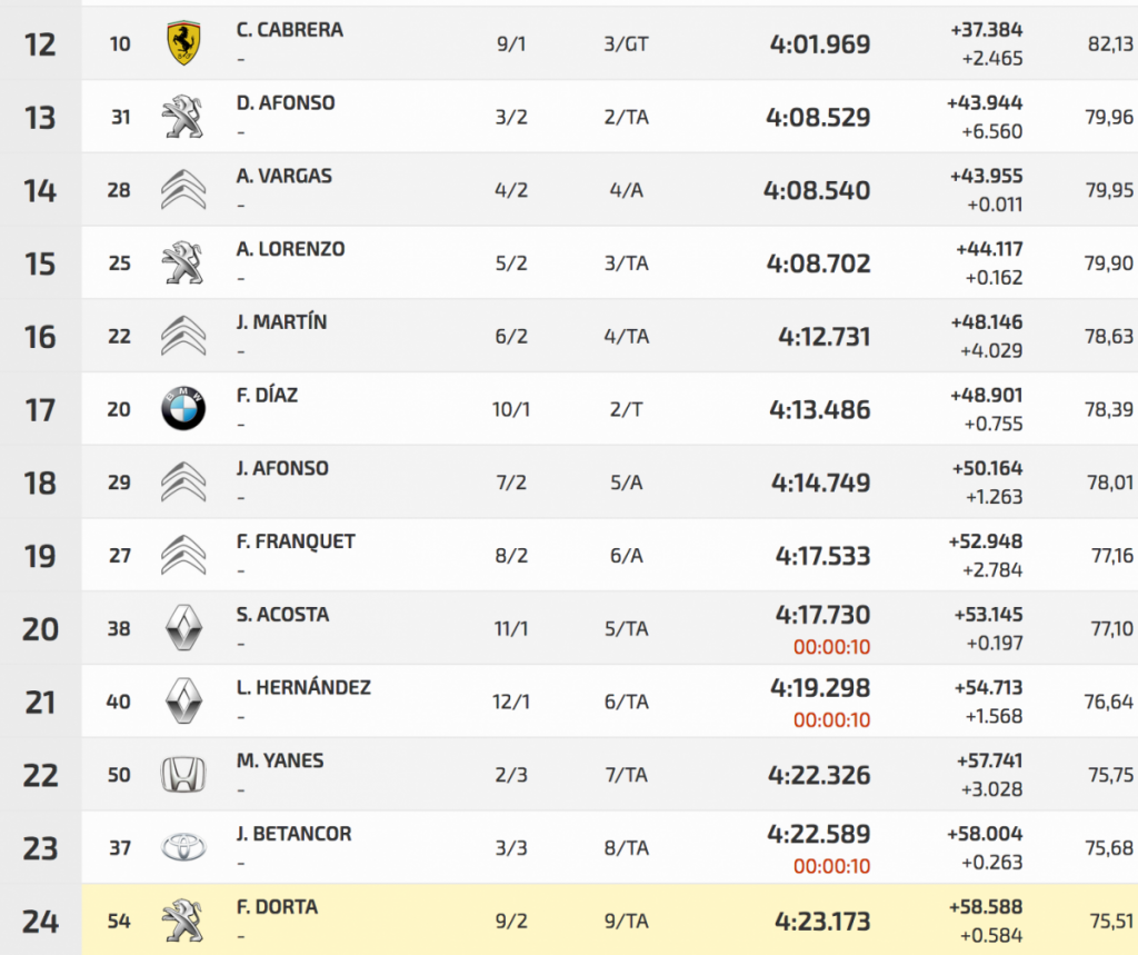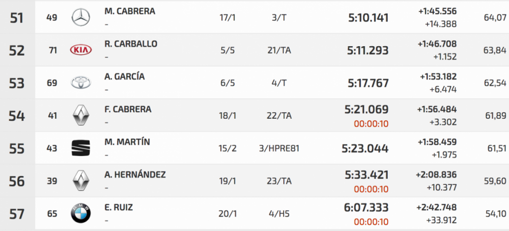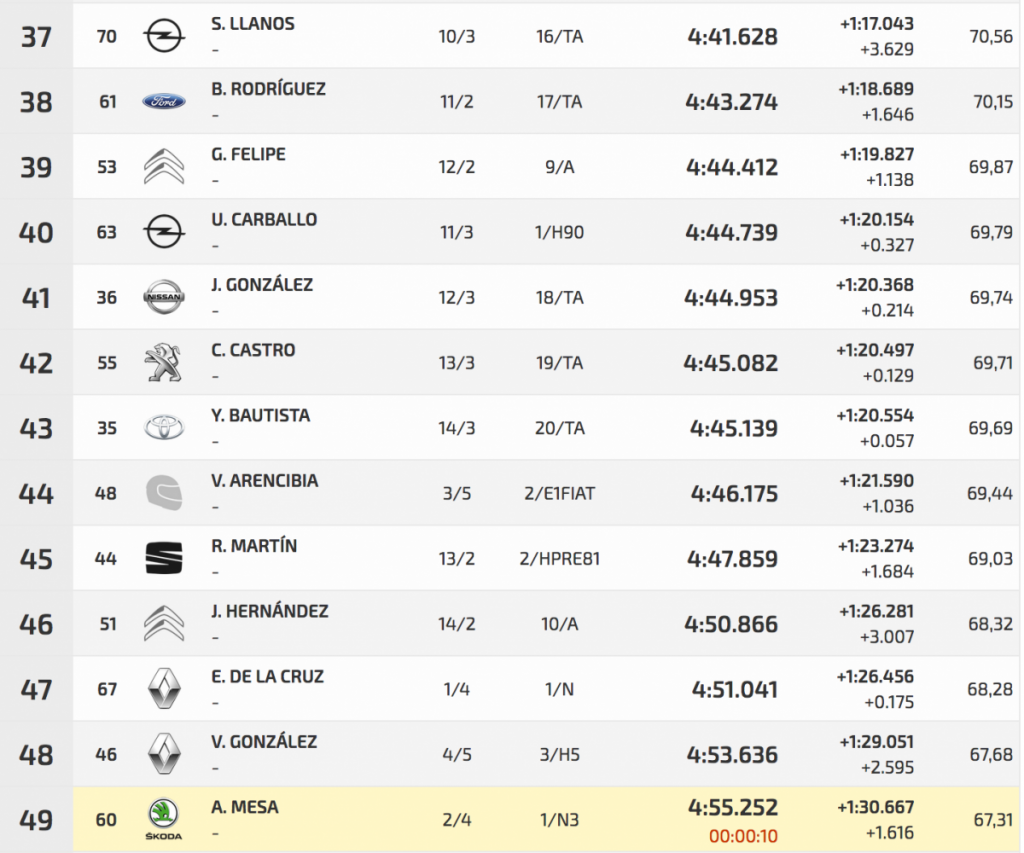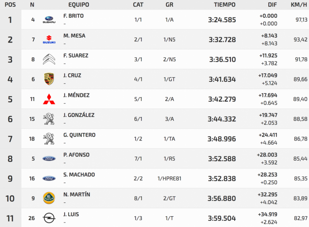 Segundo fue otro veterano, Manolo Mesa, que con su Suzuki Swfit N5 se quedaba a 8.143. Tercero fue Fran Suárez (Citroën DS3 N5), mientras que Pedro Javier Afonso (Ford Fiesta R5), segundo en la de entrenos, sufría un trompo y se iba al octavo puesto.