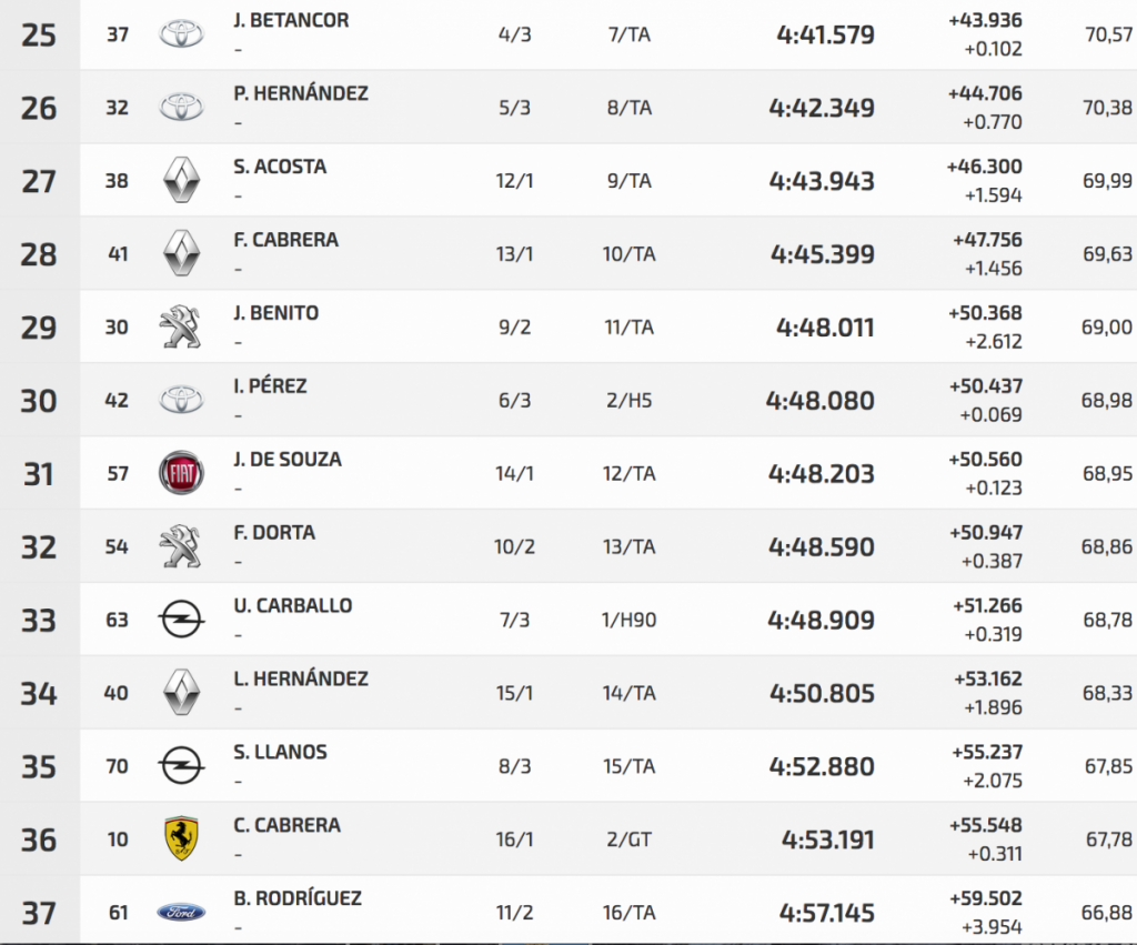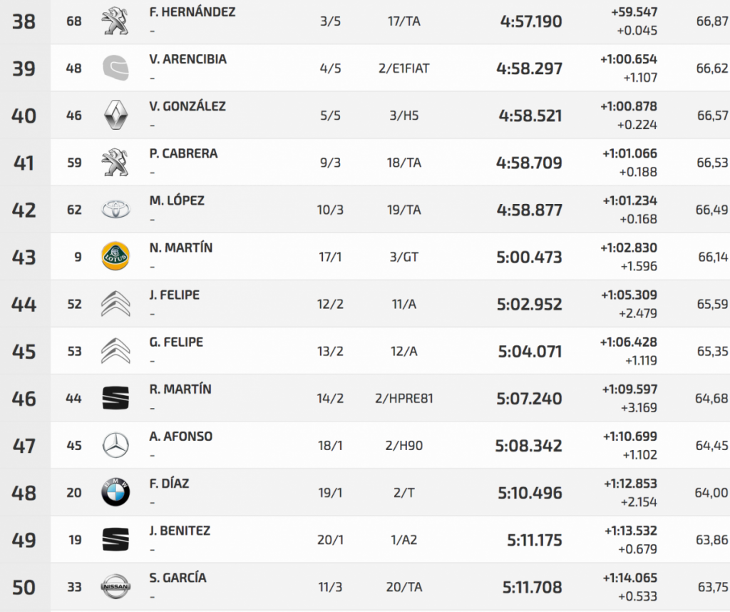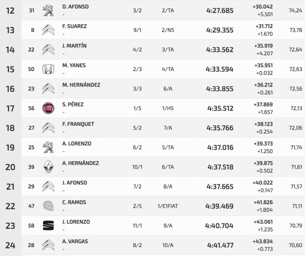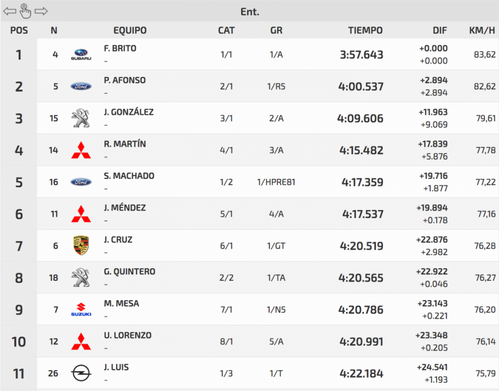 En su primera toma de contacto con su nuevo Subaru impreza WRC S2 Félix Brito ha logrado ser el más rápido en los entrenos en la Subida a Palo Blanco. Logró superar a Pedro Javier Afonso (Ford Fiesta R5) en 2.894, aunque éste se vio frenado por Fran Suárez (Citroën DS3 N5), que tuvo algún problema.