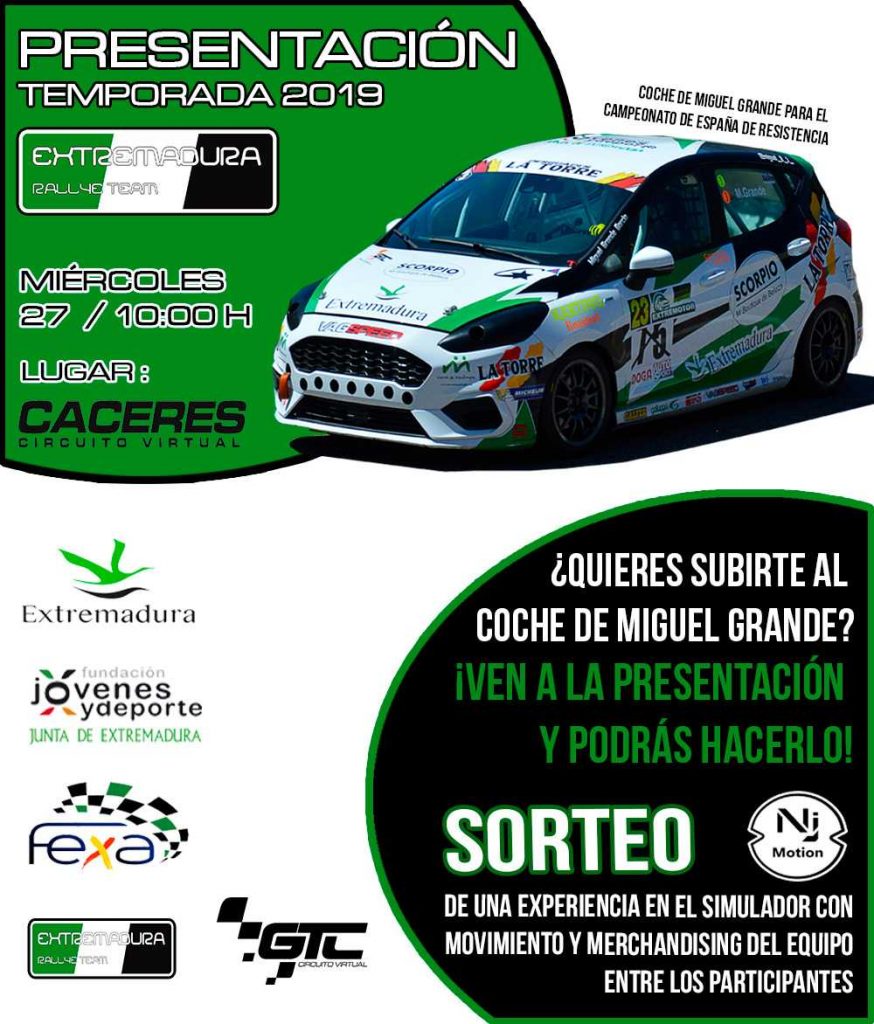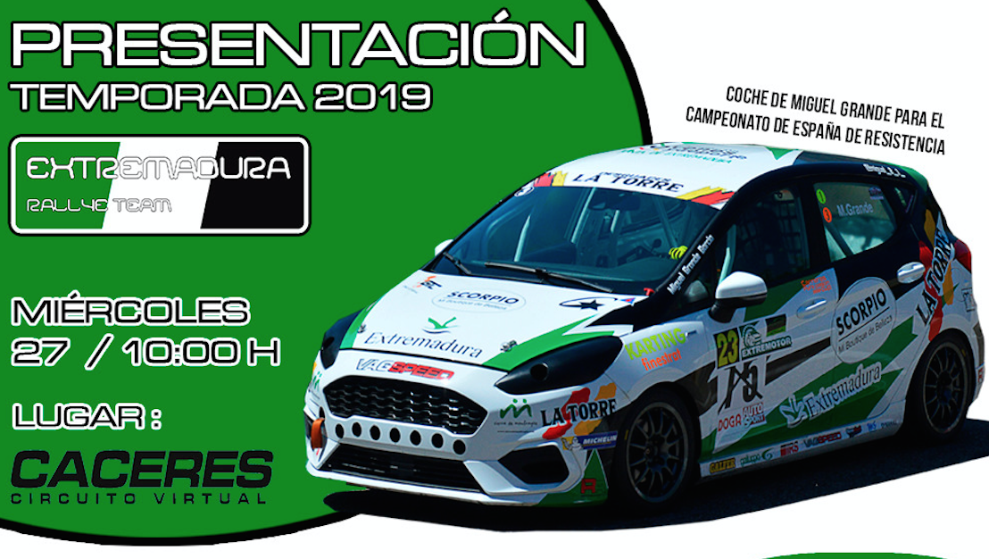 El Extremadura Rallye Team ha anunciado que el próximo miércoles 27 de febrero presentará la temporada 2019 para todos los integrantes de la formación deportiva. El evento se celebrará a las 10 horas en el Circuito Virtual GTC Cáceres ubicado en la avenida Virgen de Guadalupe 41 de la capital cacereña. Han confirmado su presencia, el Director General de Deportes de la Junta de Extremadura, D. Manuel José Hernández, y el presidente de la Federación Extremeña de Automovilismo, D. Marcos Cerezo.