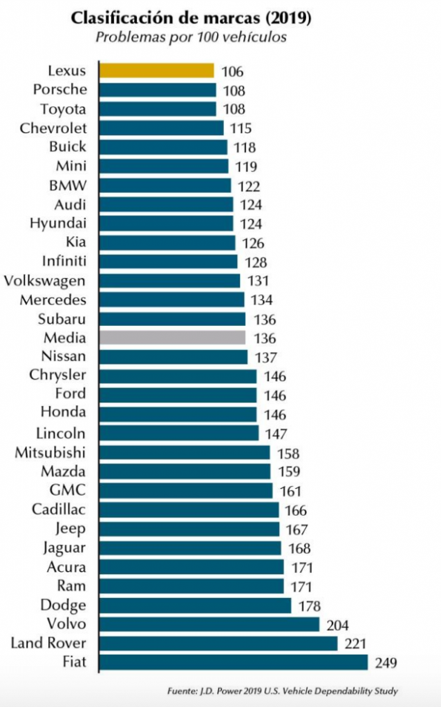 Y por octavo año consecutivo, Lexus, la marca Premium japonesa, se sitúa en el primer puesto con 106 problemas por 100 vehículos. En segundo y tercer lugar, Porsche y Toyota empatan con 108 problemas por 100 vehículos. Como conclusión, el estudio afirma que “si quieres un coche que se mantenga en buenas condiciones a lo largo de los años, elige un Lexus.