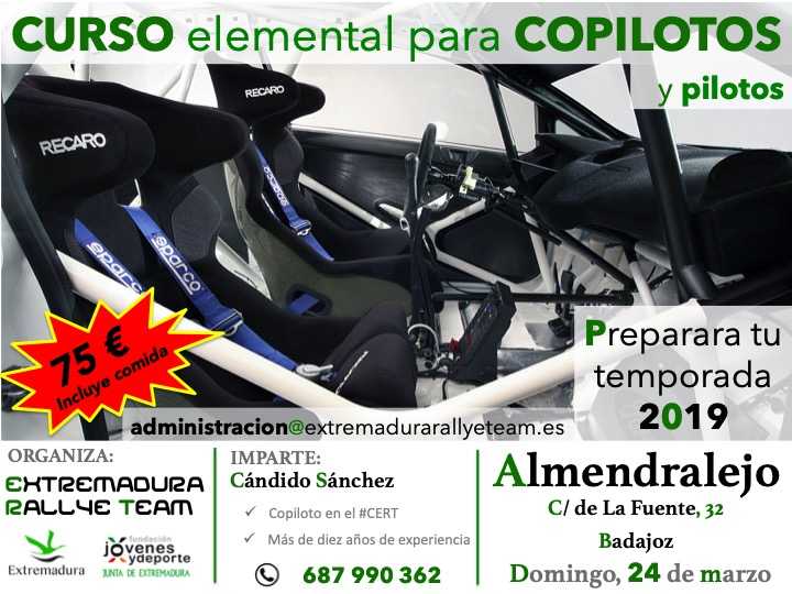 El Extremadura Rallye Team se complacen en presentar un curso de formación destinado a aquellos equipos que comiencen su andadura en la competición deportiva de Rallyes y para aquellos que quieran reforzar sus conocimientos acerca de la especialidad. Será el próximo 24 de marzo y la hora de comienzo serán las 9:00.