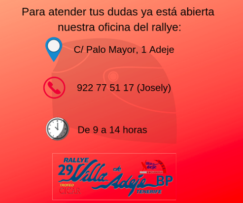 Por otro lado, la oficina permanente de la prueba ha abierto sus puertas en la sede de la escudería Adeje (Pabellón Municipal, calle Palo Mayor, 1) en horario de 9 a 14 horas.