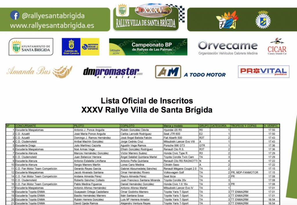 El XXXV Rallye Villa de Santa Brígida acelera el pulso a escasos días de que la acción sobre la carretera sea protagonista y, sobre todo, después de su presentación oficial realizada en la noche del miércoles en la Biblioteca Municipal del municipio grancanario. Minutos antes, en la web oficial, www.rallyesantabrigida.es, se publicaba la lista de inscritos, la cual está encabezada por el Hyundai i20 R5 de Antonio Ponce y Rubén González.