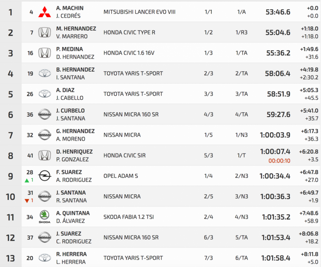 Grandísima actuación también de Basi Hernández e Iban Santana (Toyota Yaris T-Sport), cuartos de la general y primeros de la Copa Toyota Enma 2RM, superando en 45.5 a Aday Díaz y Judith del P. Cabello, con el otro Yaris en su estreno en esta monomarca.