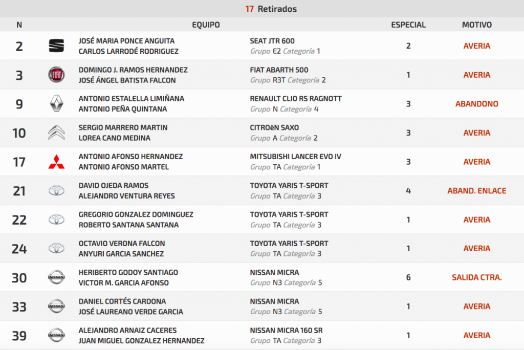 La ausencia de los grandes favoritos al triunfo, Toñi Ponce y Rubén González (Hyundai i20 R5) posibilitaron que los conejeros impusieran su ritmo desde el primer tramo cronometrado de la cita satauteña, Llanos María Rivera – Los Silos (15,260 km), donde superaban a los otros favoritos, José María Ponce y Carlos Larrodé (Seat 600 JTR) en 15.8, aunque en la siguiente especial la mecánica les impedía seguir en carrera. Esta fue una de la tónica de la primera carrera del Campeonato Provincial de Las Palmas de Rallys de Asfalto 2019, la de los abandonos de muchos de los grandes favoritos a estar en la parte alta, casos de Domingo Ramos y Pepo Batista en el estreno de su Fiat Abarth 500 R3T, Sergio Marrero y Lorea Cano (Citroën Saxo Kit Car), entre otros.