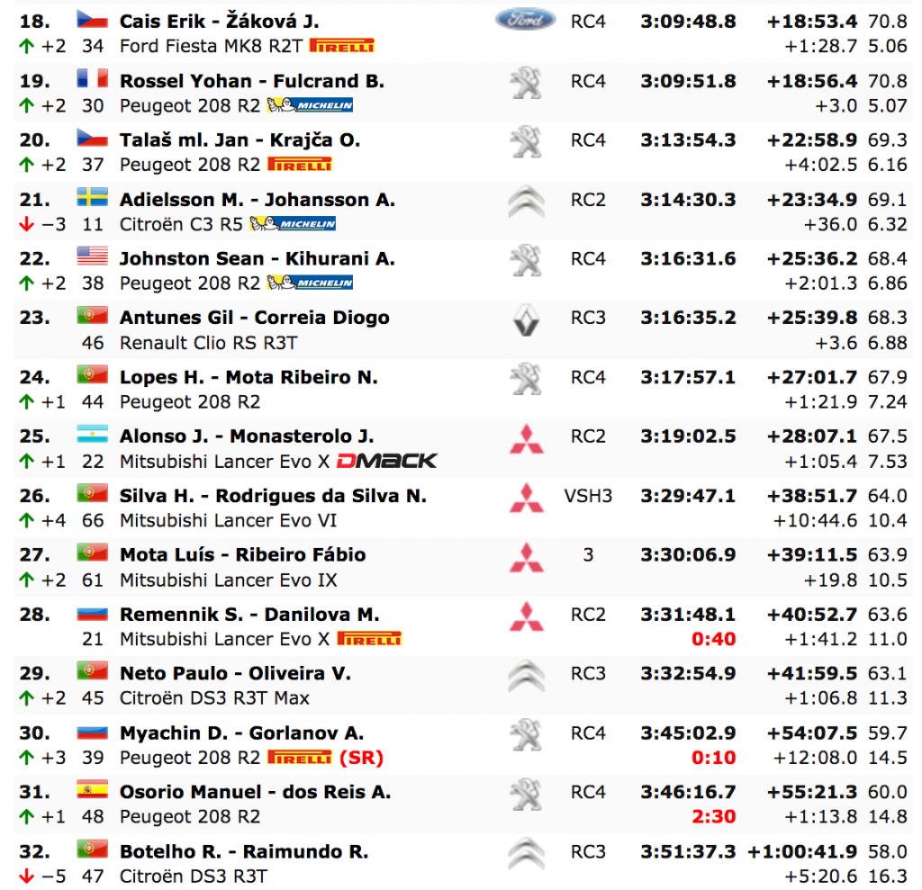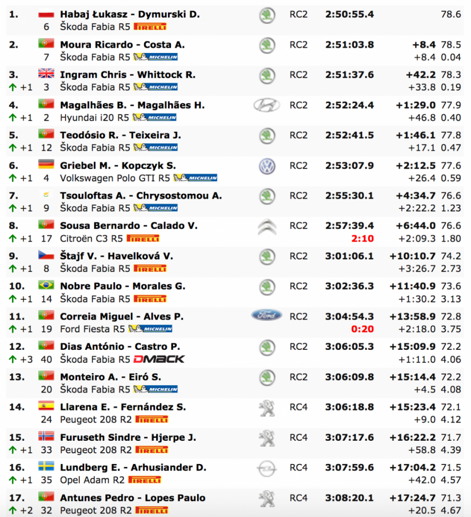 Su desgracia hizo que Chris Ingram, ganador junior del ERC1, subiera a la posición final del podio, terminando a 42.2 del ganador del rally, Habaj, con Bruno Magalhães, del Equipo Hyundai Portugal, cuarto, y Ricardo Teodósio completando los cinco primeros.