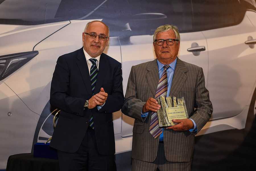 -Antonio Morales, presidente del Cabildo Insular de Gran Canaria, entrega una placa al periodista Juan José Alonso Prieto, en reconocimiento a su labor informativa en el sector del motor.