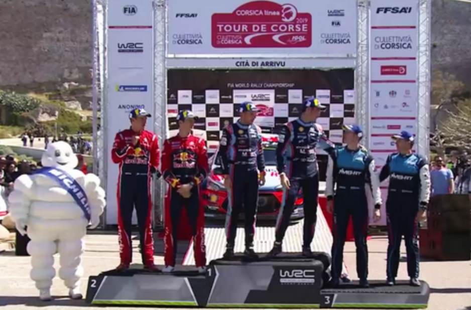 Neuville se dirigía a la ceremonia de podio en Calvi creyendo que había terminado segundo cuando descubrió que el líder Evans había pinchado un neumático en el último tramo.