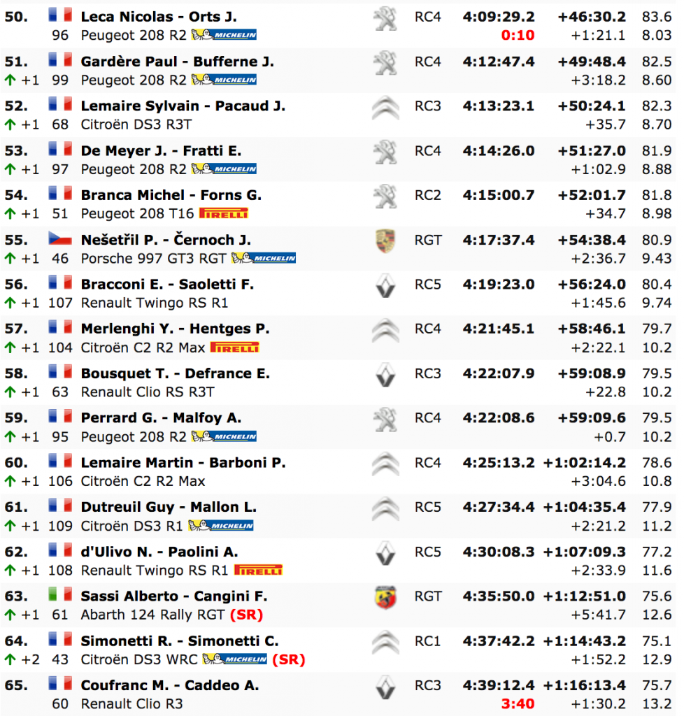 Sébastien Ogier se ha visto de golpe en la segunda posición, 40,3 segundos por detrás de Neuville, tras un tórrido rallye con su Citroën C3. Los problemas de pilotaje ralentizaron al francés y, a pesar de los numerosos cambios en la puesta a punto, nunca encontró el ritmo que esperaba. Acabó 26,3 segundos por delante de Evans.