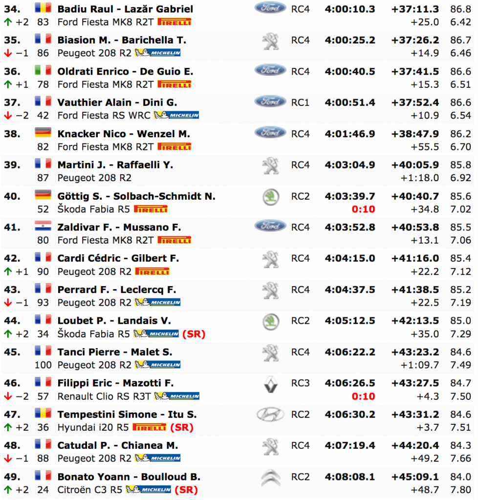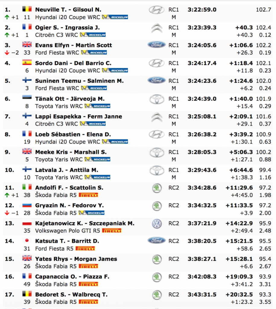Sébastien Ogier se ha visto de golpe en la segunda posición, 40,3 segundos por detrás de Neuville, tras un tórrido rallye con su Citroën C3. Los problemas de pilotaje ralentizaron al francés y, a pesar de los numerosos cambios en la puesta a punto, nunca encontró el ritmo que esperaba. Acabó 26,3 segundos por delante de Evans.