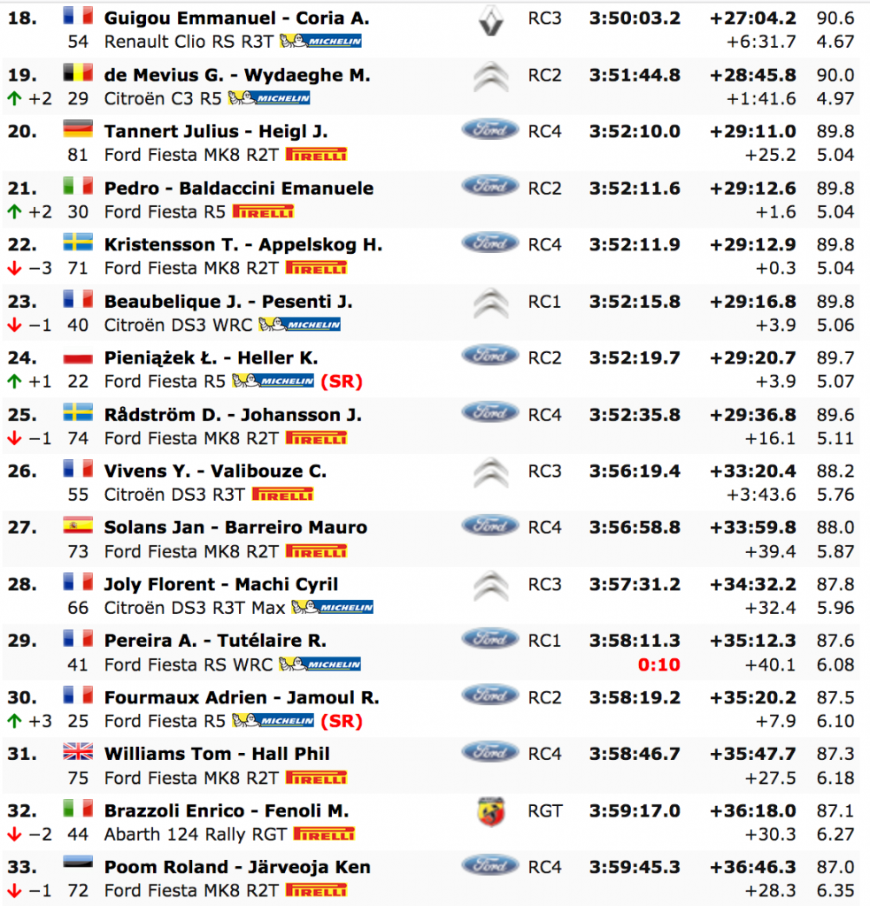 Esapekka Lappi y Sébastien Loeb fueron séptimos y octavos, con Kris Meeke y Jari-Matti Latvala como compañeros de equipo con el Yaris completando la clasificación. Meeke consoló algo a Toyota al ganar los puntos extra en el Wolf Power Satage.
