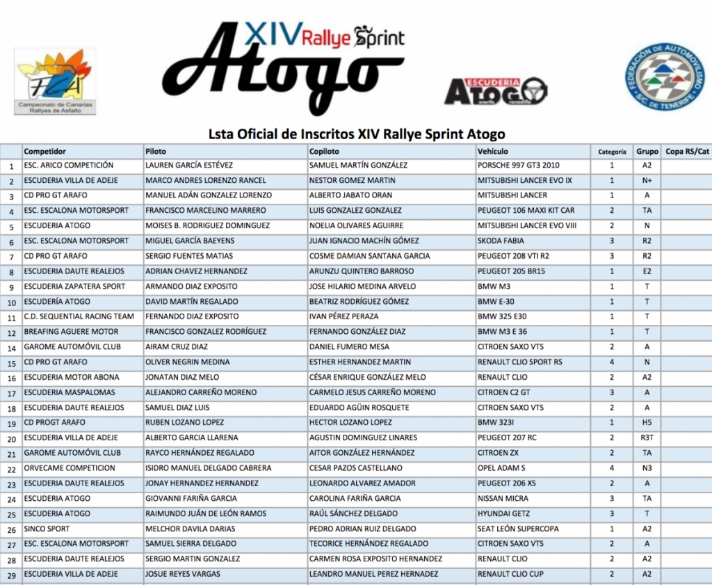 Lista oficial de inscritos del XIV Rallysprint de Atogo Por Rafa León Última actualización: 03/04/2019 20:47 Compartir FacebookTwitterWhatsAppEmailTelegramLinkedin Publicamos la lista oficial de inscritos del XIV Rallysprint de Atogo (Tenerife). AtogoCampeonato de TenerifeCanariasRallysprint de AtogoTenerife Compartir