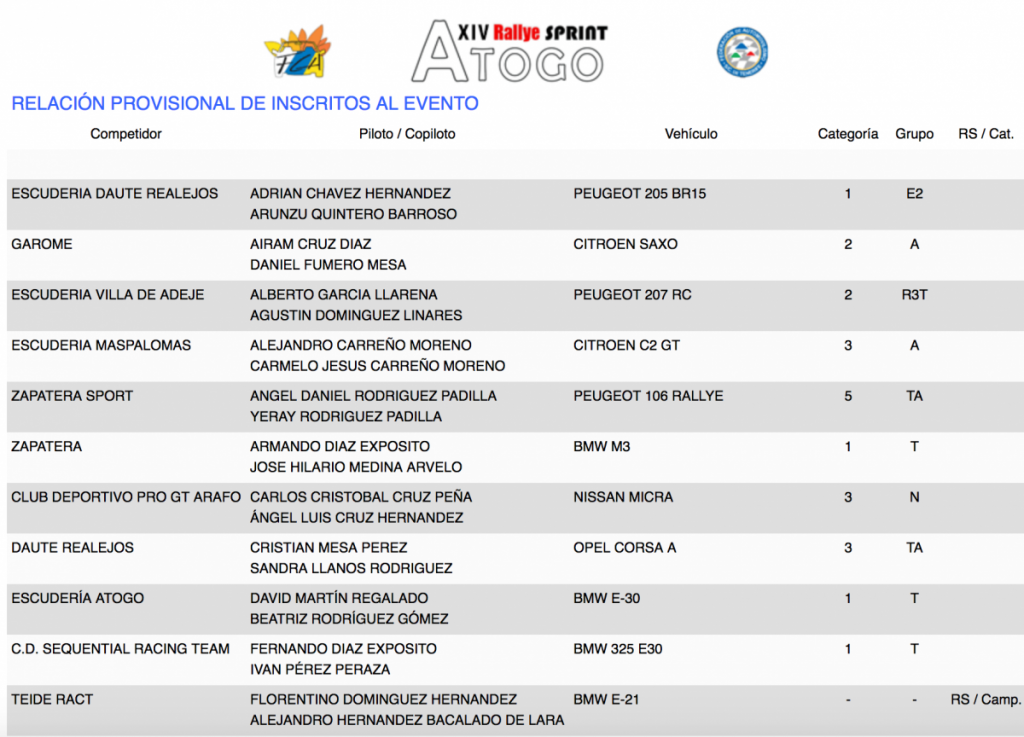 Relación provicial de inscritos del XIV Rallysprint de Atogo Por Rafa León Última actualización: 02/04/2019 21:32 Compartir FacebookTwitterWhatsAppEmailTelegramLinkedin Publicamos la relación provicial de inscritos del XIV Rallysprint de Atogo. AtogoCampeonato de TenerifeCanariasRallysprint de AtogoSanta Cruz de TenerifeTenerife Compartir