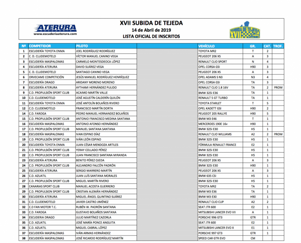 Bajo el patrocinio de Orvecame, Cicar, Cabildo de Gran Canaria y el Ayuntamiento de Tejeda, la rampa cumbrera contará con la participación como coche 0 del vehículo N5 de Juan Carlos Quintana, que será copilotado por diferentes Autoridades del Consistorio Municipal.