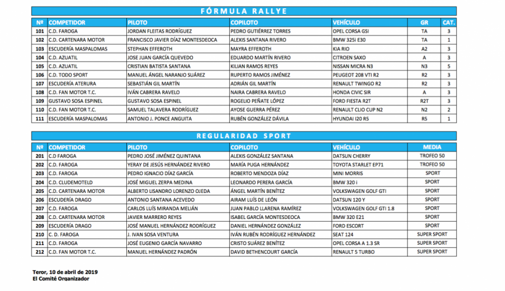En la Regularidad Sport aparecen 12 vehículos, entre ellos el campeón provincial de la pasada temporada en Super Sport, el Renault 5 Turbo de Manuel Hernández-David Bethencourt y también el de la categoría Sport, el Ford Escort de José M. Hernández y su hijo Daniel en labores de navegante.