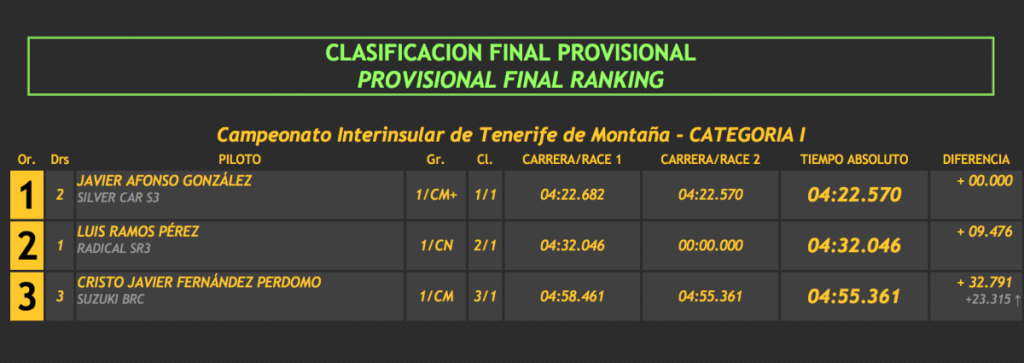 Cuarta victoria de Juan Luis Cruz en este trazado, esta vez con el Porsche 911 GT3, máquina con la que se impuso por apenas 49 centésimas de segundo ante otro Porsche, el de Nauzet Brito. En Barquetas, Javier Afonso impuso con claridad su Silver Car S3.