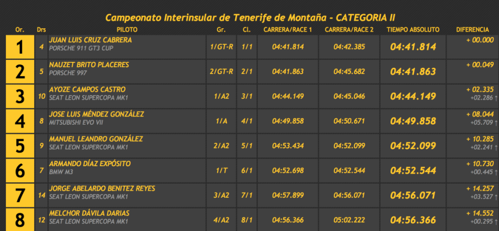 Cruz hizo bueno su tiempo en la primera manga oficial. Ese 4:41.814 le llevó a alcanzar una victoria ajustadísima. Apenas 49 centésimas le separaron del Porsche 997 de Nauzet Brito, que también realizó su mejor ascensión en la primera de las dos cronometradas oficiales. Sin duda, una pelea que captó buena parte de la atención de los miles de aficionados que habitual acuden a presenciar la prueba organizada por el Club ProGT Arafo.