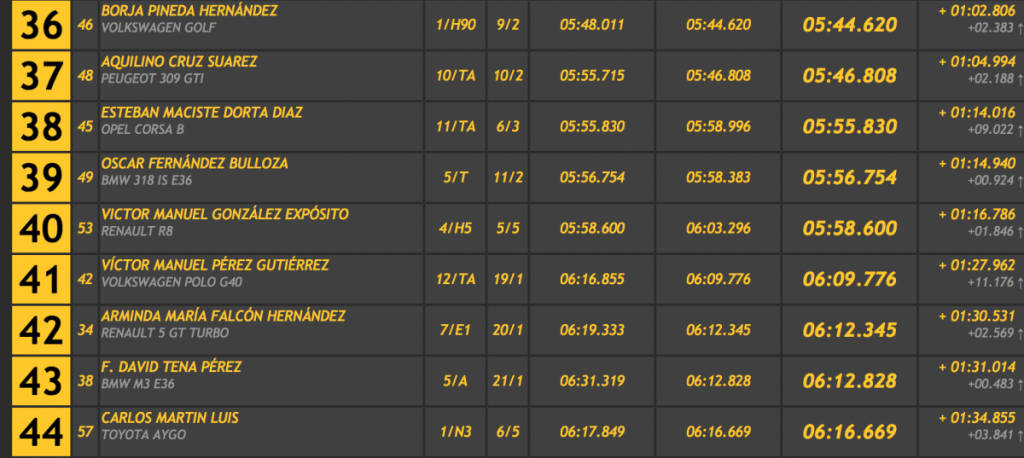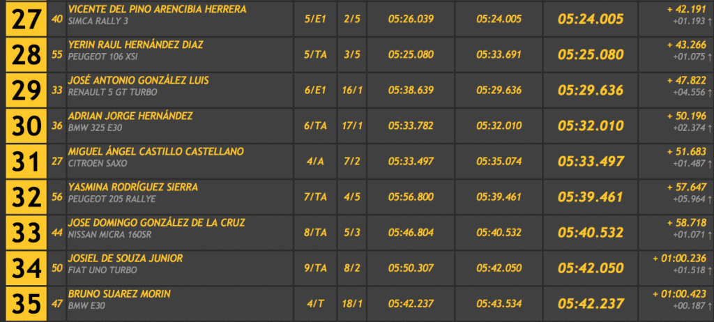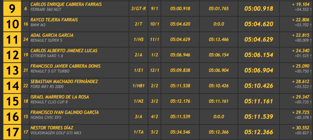 A espaldas de ellos finalizó el BMW M3 de Armando Díaz, vencedor en el Grupo T. Adal García fue el más rápido de los numerosos Renault GT Turbo, ganando entre los H5 y quedándose a nueve milésimas de entrar entre los diez primeros. Carlos Jiménez, con un Citroën Saxo, se llevó la Categoría 2, Miguel Ángel Hernández (Honda Civic) la Categoría 3 y Carlos Ramos (Simca Rally 3) la Categoría 5.