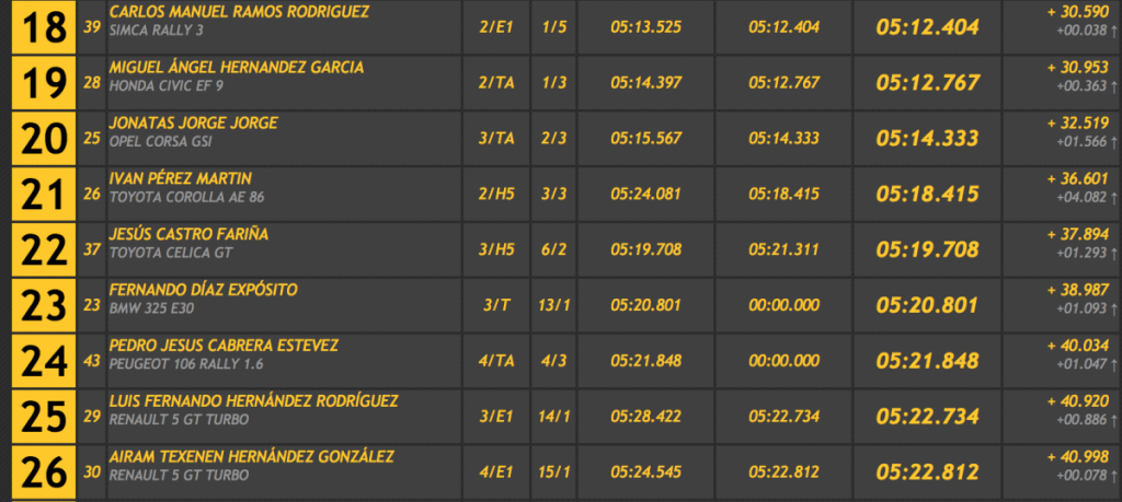 Por otro lado, Sebastián Machado (Ford Escort), campeón nacional de Grupo H, se impuso en el H81, Israel Marrero (Renault Clio Cup R) hizo lo propio entre los N2 y Francisco Cabrera (Renault 5 GT Turbo) en el apartado E1. Borja Pineda (Volkswagen Golf) se apuntó el H90 mientras que, Néstor Torres, clasificó su Volkswagen Golf GTI como el Grupo TA más rápido. Carlos Martín, vencedor de la fórmula promocional ideada por el Club ProGT Arafo y Rally Experience, concluyó su primera experiencia en competición con triunfo entre los N3 al volante de un Toyota Aygo.