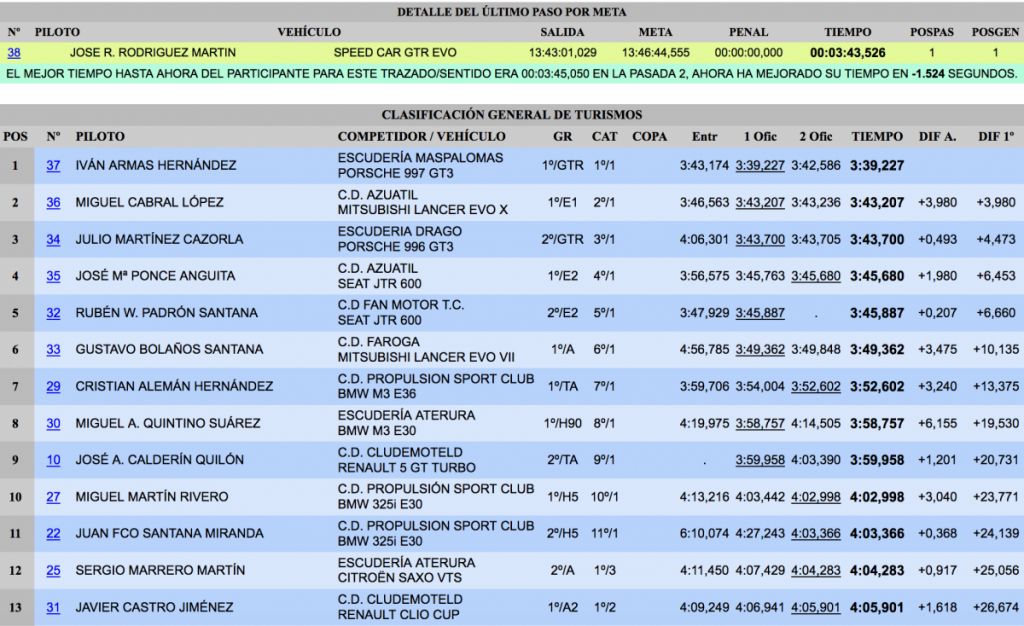 Iván Armas (Porsche 997 GT3) consiguió la victoria en la 17ª edición de la Subida de Tejeda, superando en 3,980 al segundo clasificado, Miguel Cabral (Mitsubishi Lancer Evo X), que prácticamente calcó sus dos registros, mientras que Armas logró su mejor crono en la primera ascensión, el que le valió para quedarse, también, con el récord de la cita grancanaria.