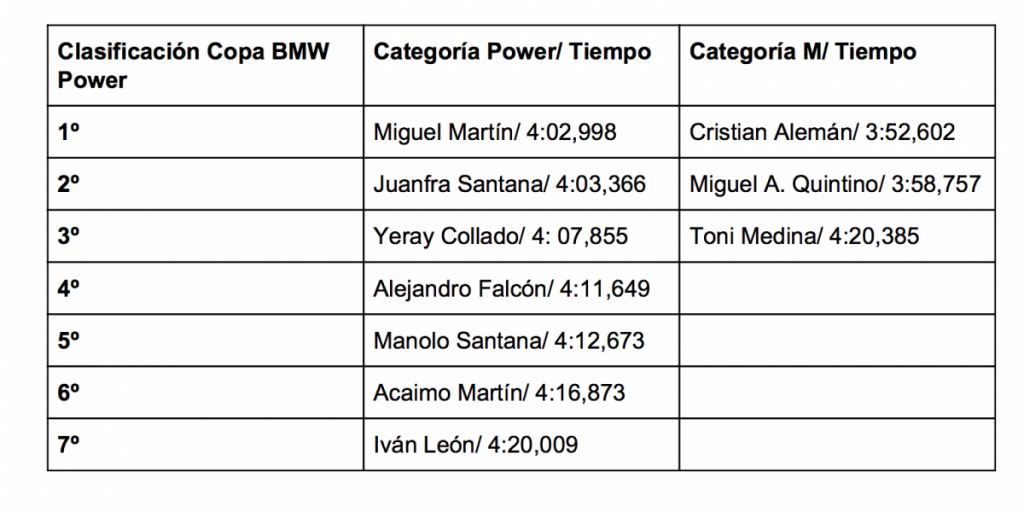 - – 7 en la categoría Power: Miguel Martín (BMW 325i E30), Manolo Santana (BMW 325i E30) , Acaimo Martín (BMW 325i E36) , Alejandro Falcón (BMW 325i E30), Juanfra Santana (BMW 325i E30), Yeray Collado (BMW 325i E30) e Iván León (BMW 325i E30).
