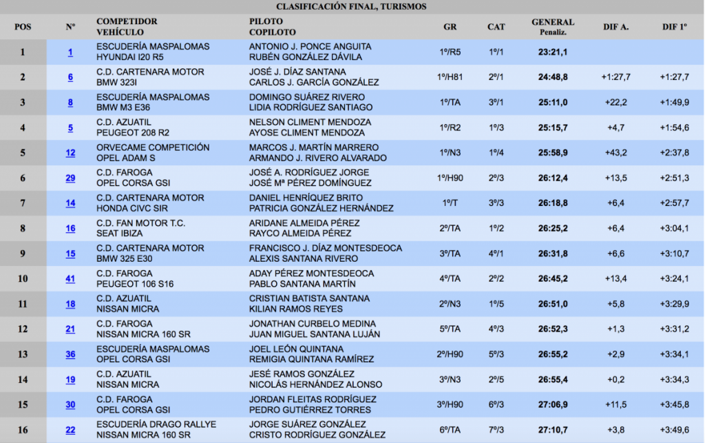 La categoría 1 se la llevó Francisco Díaz-Alexis Santana con el BMW, mientras la categoría 2 fue ganada por Aridane y Rayco Almeida con el SEAT Ibiza. Ya en la categoría 5 se impusieron Cristian Batista-Lilian Ramos con el Nissan Micra «copa». Por grupos, el H81 fue también para los segundos clasificados de la general, mientras el H90 se lo llevó José Rodríguez-José Pérez con el Opel Corsa, mientras el Honda de Daniel Henríquez-Patricia González fueron los vencedores del grupo T.