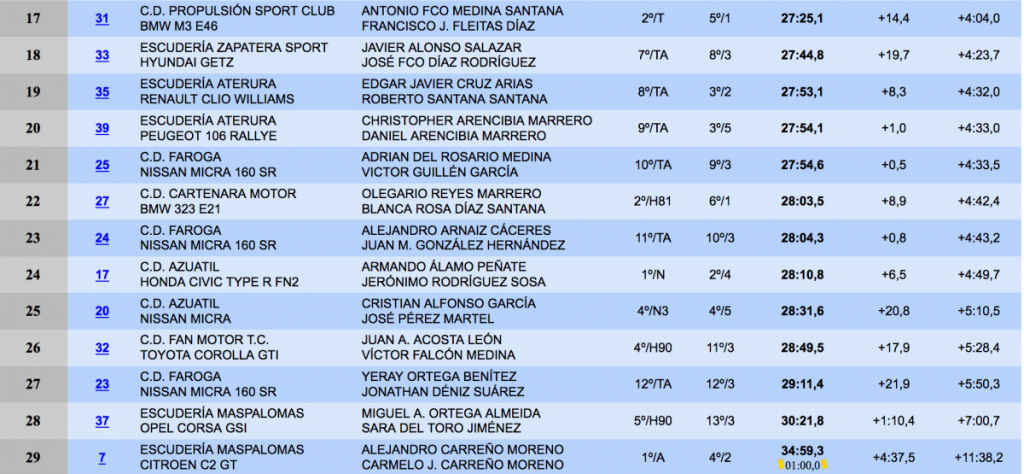 El equipo tinerfeño formado por Javier Alonso y José Díaz con el Hyundai Getz lograron el puesto 18º de la general, lo que les viene muy bien para sus intereses dentro del campeonato regional, mientras los hermanos Carreño después de los problemas que le afectaron. a pesar de acabar en el último lugar de la tabla, también sumarán puntos para dicho certamen.