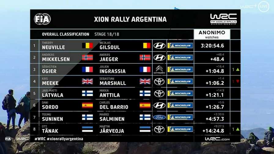 Sébastien Ogier ha sido tercero con su Citroën C3, a 16,4 segundos, en un final dramático en la emblemática especial de El Condór. Superó a Kris Meeke, quien luchó con un pinchazo en su Toyota Yaris durante los últimos 5 kilómetros. La diferencia entre ellos era de 1,4 segundos.