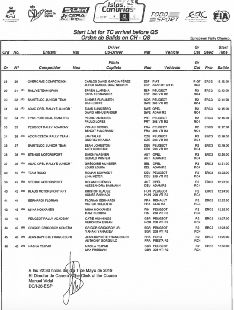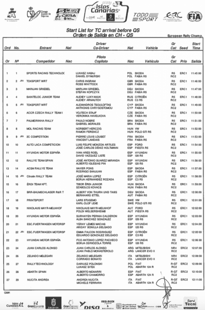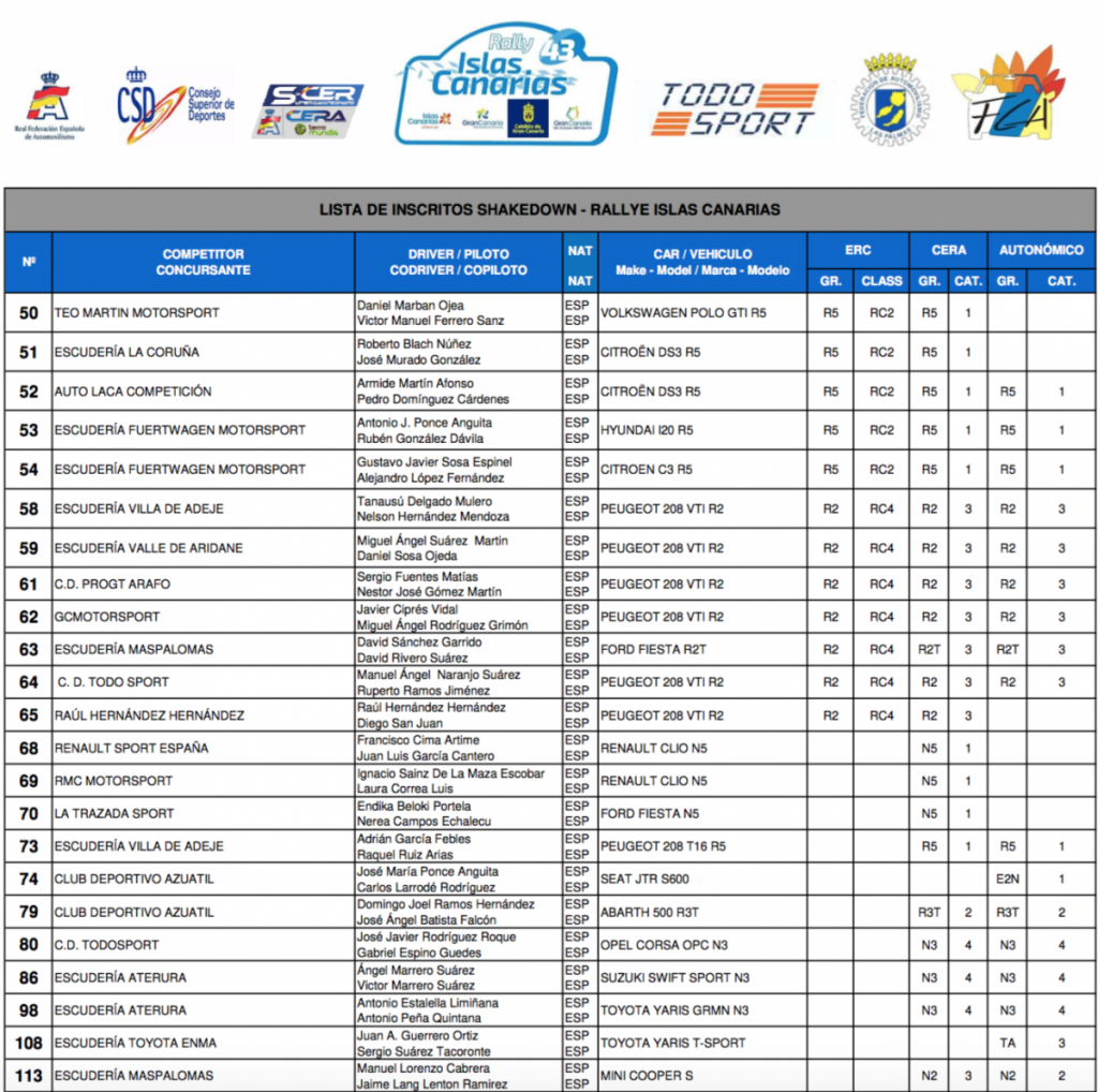 Adjuntamos listas de inscritos con los equipos que tomarán parte en el Qualifying Stage y el Shakedown del 43 Rally Islas Canarias que tendrá lugar en el municipio de Valsequillo este jueves 2 de mayo por la mañana.
