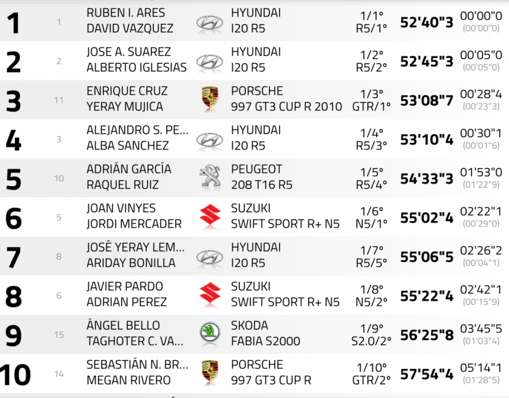 Terceros son los líderes del apartado Autonómico de Canarias Enrique Cruz y Yeray Mújica (Porsche 911 GT3), que están a 28.4 de la cabeza y tiene tras de si a 1.6 a Surhayen Pernía y Alba Sánchez con la tercera unidad Hyundai i20 R5.