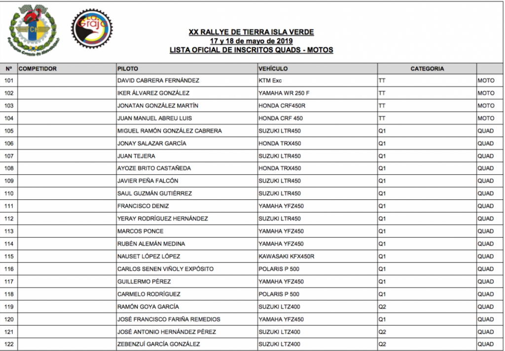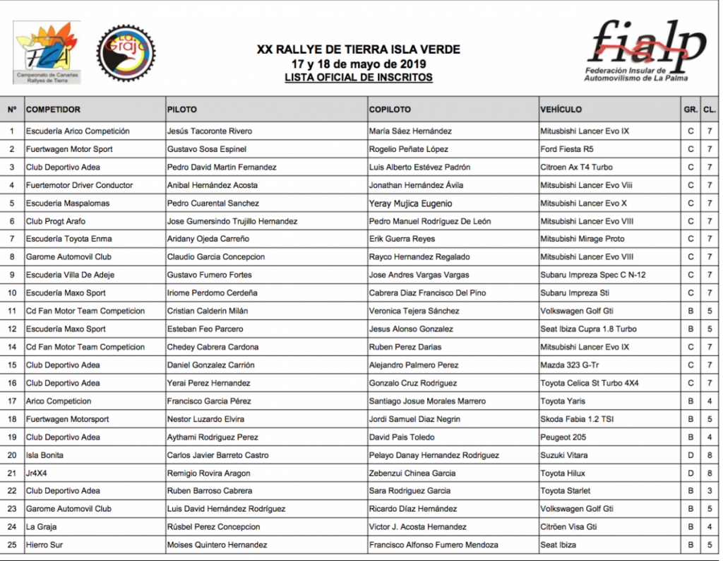Y la lista de candidatos para las primeras plazas sigue con Aníbal y Jonathan Hernández con su habitual Lancer Evo y con similar montura también están inscritos Chedey Cabrera-Rubén Pérez, Claudio García-Rayco Hernández, José Trujillo-Pedro Rodríguez y Pedro Cuarental-Yeray Mujica, este último con un Evo X.