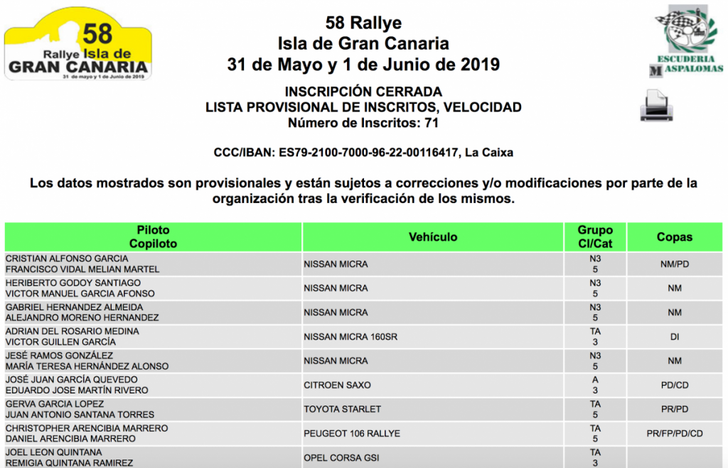 El 58 Rallye Isla de Gran Canaria, cita del Campeonato de Las Palmas de Rallys, cerró en la tarde de este viernes su periodo de inscripción, siendo la lista de alta calidad de pilotos y monturas.