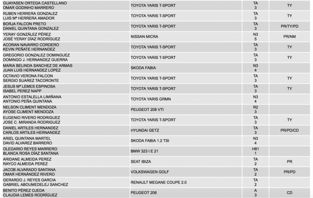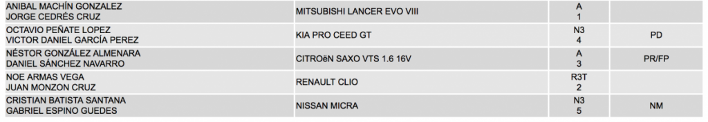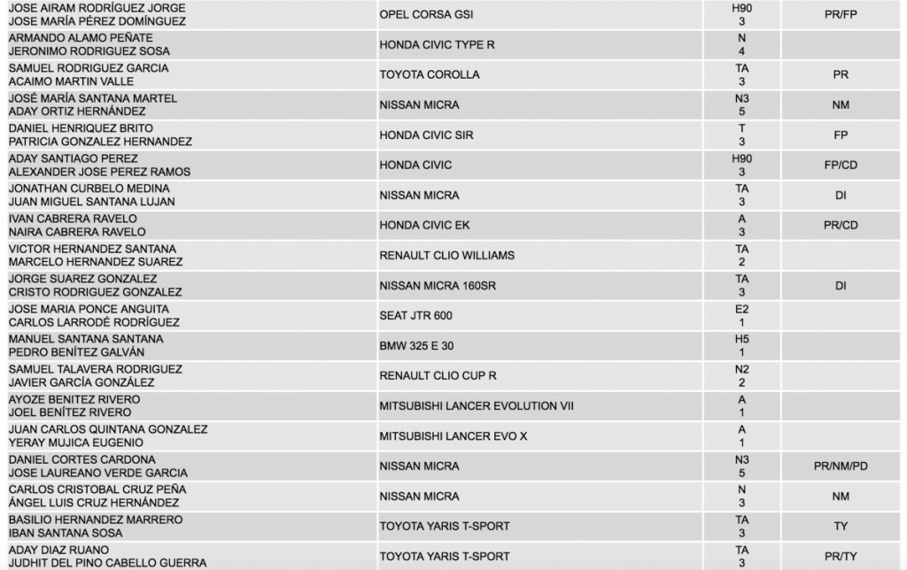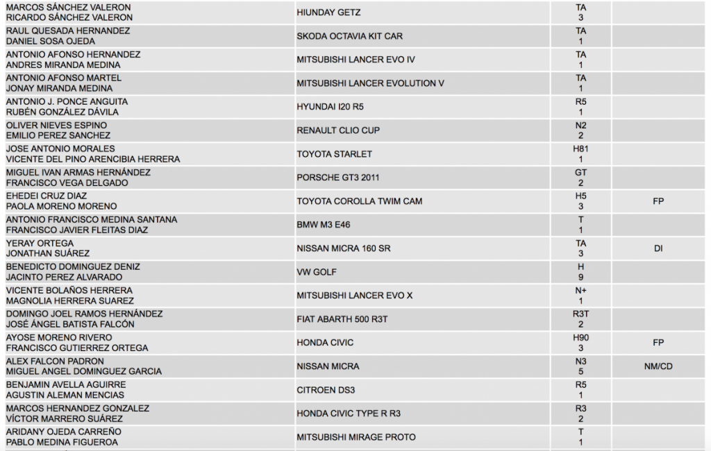 La lista sigue con Juan Carlos Quintana y Vicente Bolaños con sendos Evo X, José Mari Ponce con el Seat 600, Ayoze Benítez con su Evo VII, Raúl Quesada con el Octavia Kit Car, Marcos Hernández con su Honda Civic Type R R3, Aridane Ojeda con su Mitsubishi Mirage Proto, Domingo Ramos con su Abarth 500 R3T, Guayasén Ortega con el Toyota Yaris o los Antonio Afonso, padre e hijo, con un Evo Iv y V, entre otros.