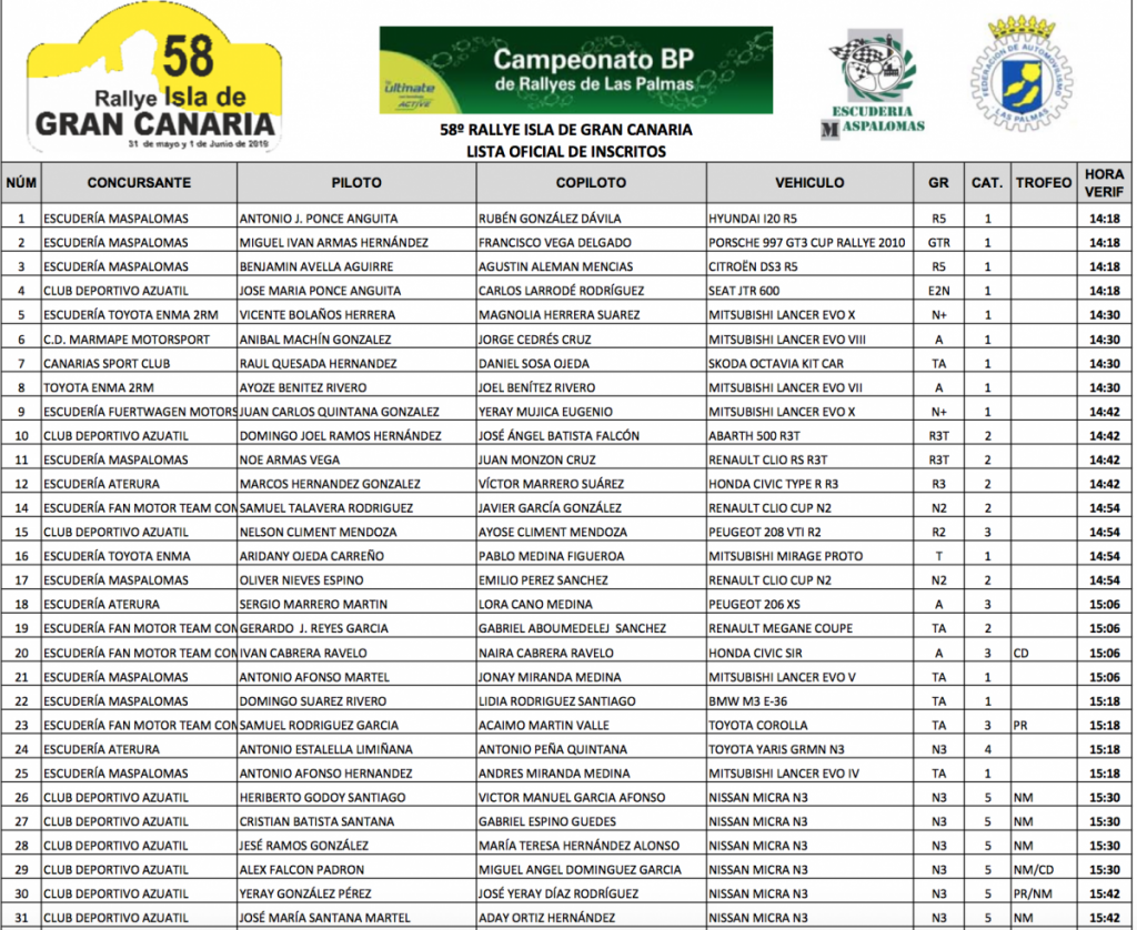 El Campeonato BP de Rallys de Las Palmas tiene su tercera cita prueba puntuable con el 58º Rallye Isla de Gran Canaria, organizado por la Escudería Maspalomas, que se disputa a partir de este viernes 31 de mayo, con una lista de 87 equipos participantes.