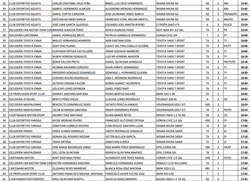 La prueba arranca este viernes con las verificaciones en el centro comercial Los Alisios, a partir de las 14 horas, entrando los vehículos por orden ascendente de la lista. De hecho, los vehículos de los primeros pilotos (Toñi, Iván y Avella) realizarán este trámite a partir de las 14:18 horas, finalizando a las 18:30 horas con los últimos coches de RS.