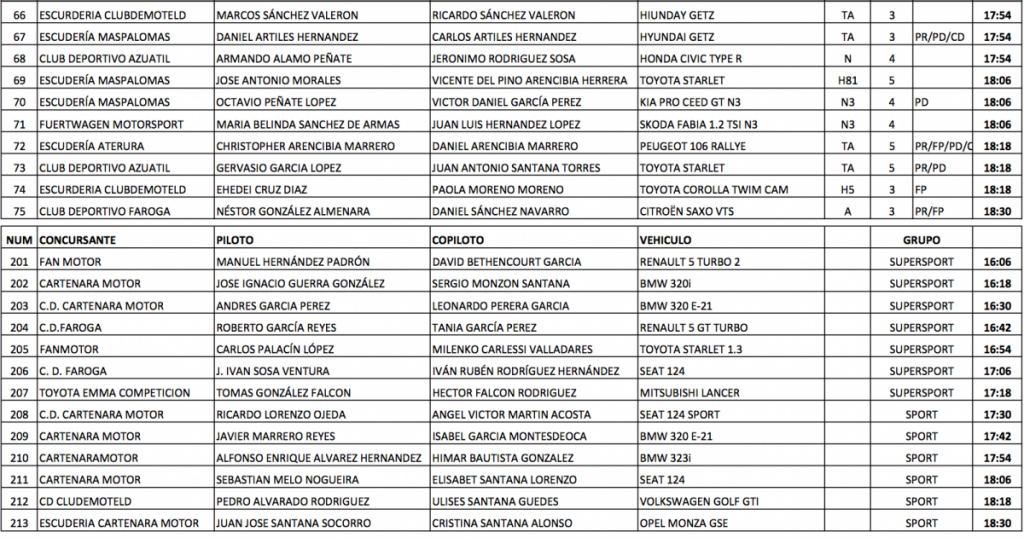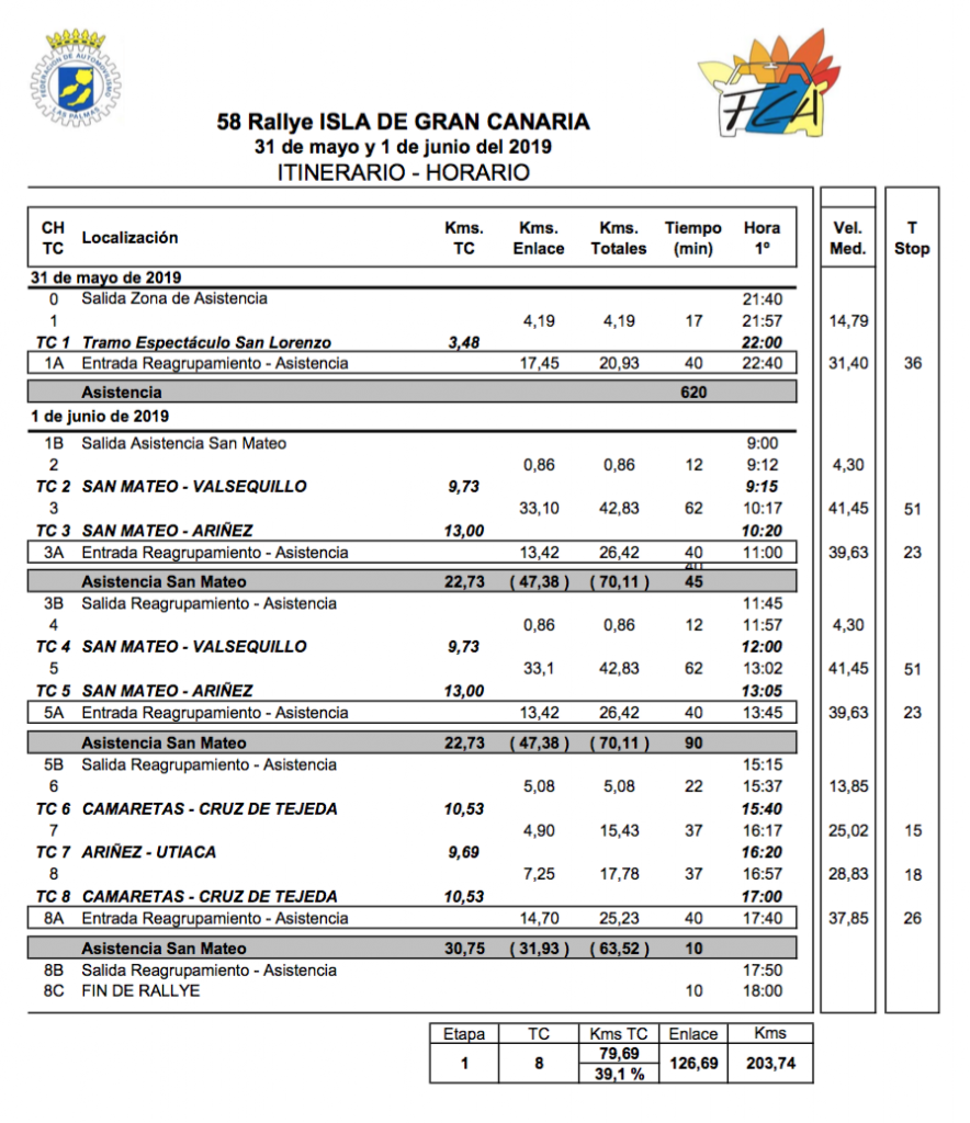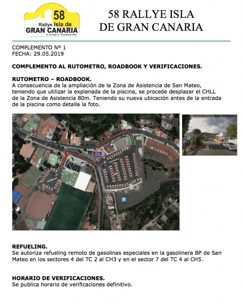 La organización ha publicado conjuntamente con la lista oficial por orden de salida y horario de verificaciones, un complemento al rutómetro para informar de la ampliación de la zona de asistencia en San Mateo y la localización del control horario, motivada por la alta participación en este rallye.