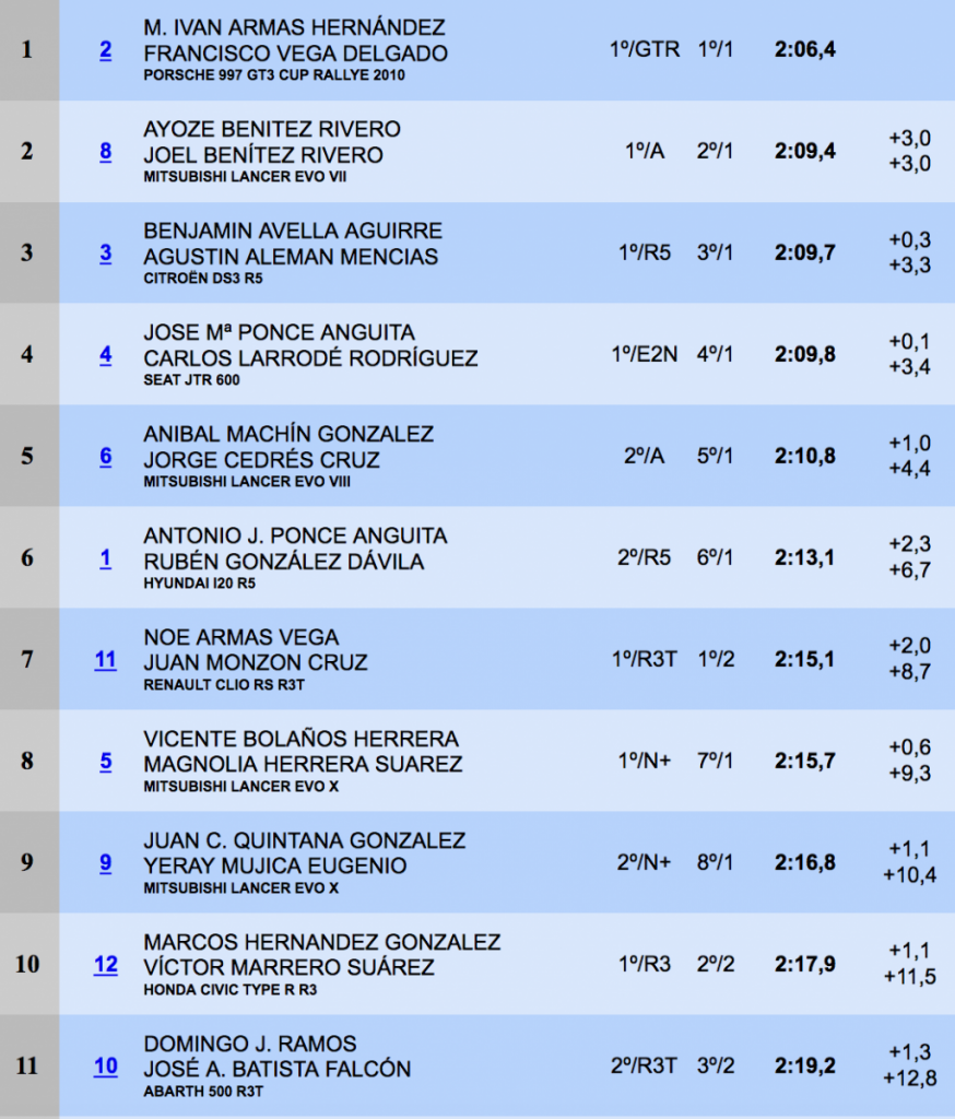 Noe Armas y Juan Monzón (Renault Clio RS R3T) se situaron séptimos, seguidos de Vicente Bolaños y Magnolia Herrera (Mitsubishi Lancer Evo X), Juan Carlos Quintana y Yeray Mujica (Mitsubishi Lancer Evo X) y Marcos Hernández y Víctor Marrero (Honda Civic Type R R3), que cerraron los diez primeros.