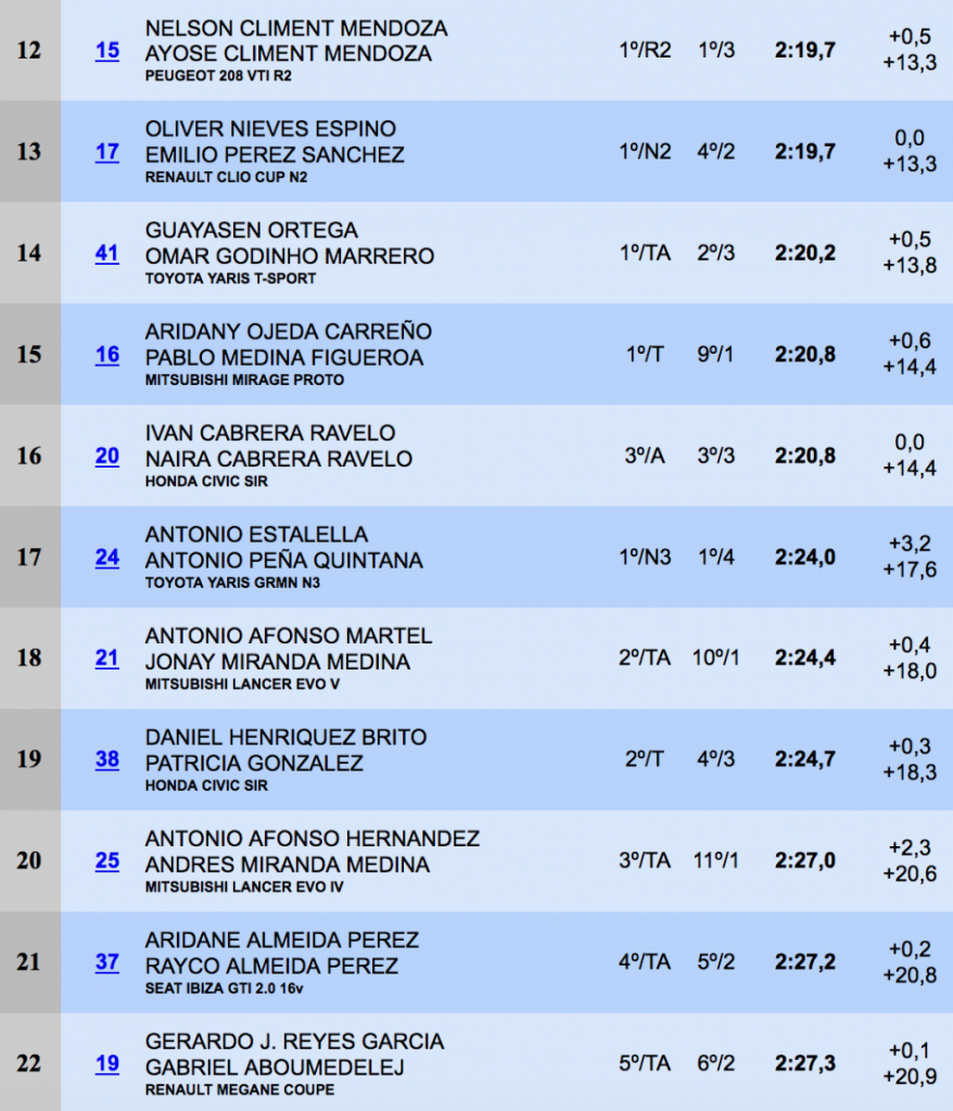Domingo Ramos y Pepo Batista (Abarth 500 R3T) son undécimos, seguidos a 0.5 de Nelson Climent y Ayoze Climent (Peugeot 208 VTI R2), que empatan con Oliver Nieves y Emilio Pérez en su estreno del Renault Clio Cup N2. Los primeros clasificados del Trofeo Toyota Enma-2RM, Guayasén Ortega y Omar Godinho (Toyota Yaris TS), son décimo cuartos, con Aridany Ojeda y Pablo Medina, que se baja de su Suzuki Swift para subirse a la derecha en el Mitsubishi Mirage Proto.