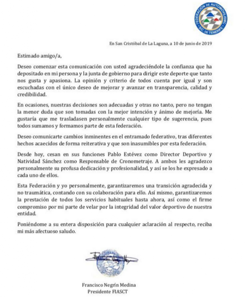 Por medio de una carta de su presidente, Francisco Negrín Medina, nos enteramos del cese de Pablo Estévez como Director Deportivo y de Natividad Sánchez como Responsable de Cronometraje de la FIASCT.