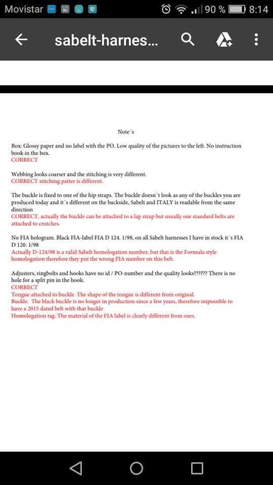Pasadas las semanas se ha puesto en contacto con Sabelt Italia, por lo que advierte a sus compañeros sobre los arneses falsificados.