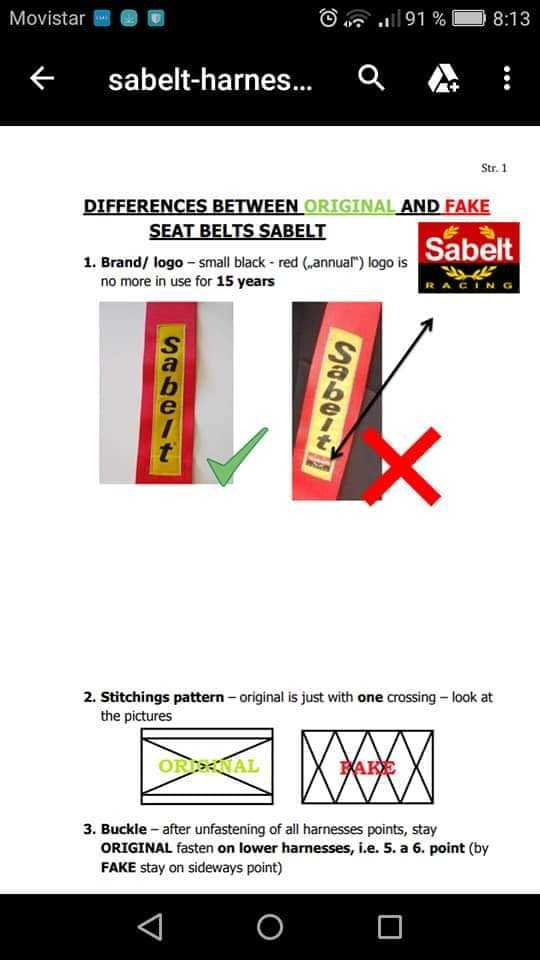 Enclosed a document that have been submitted to FIA showing the main difference between original and fake Sabelt harnesses.