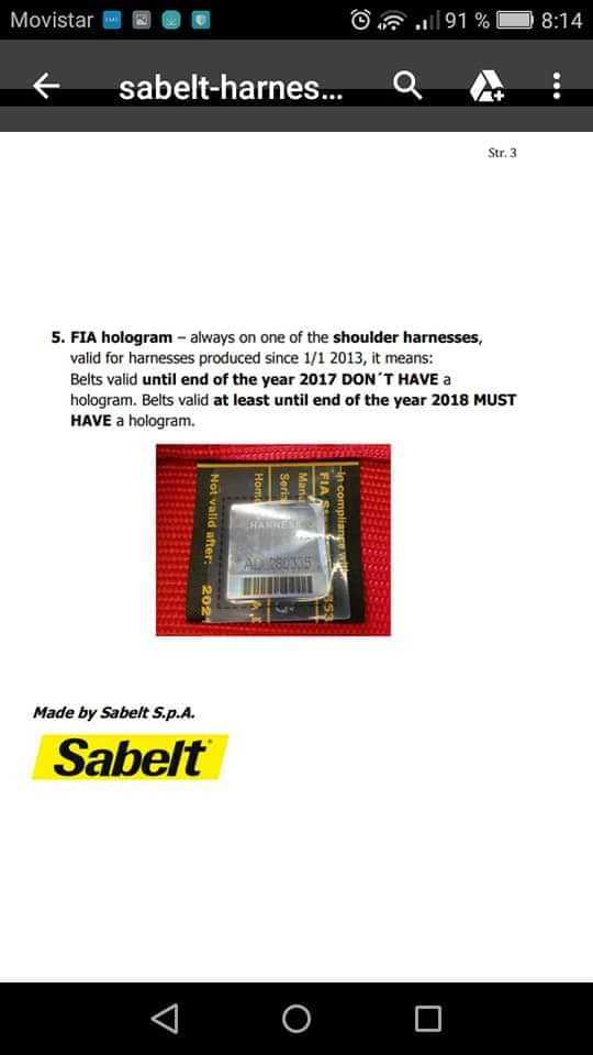 Bueno, al igual que vemos lo malo, también vemos lo bueno. A principios de esta semana me he puesto personalmente en contacto con Sabelt Italia (Adriano Sapetti) (Racing Retail Area Manager) y me han confirmado lo que ya nos habían advertido en el pasado Rally Cielo de La Palma sobre los arneses de esta marca.