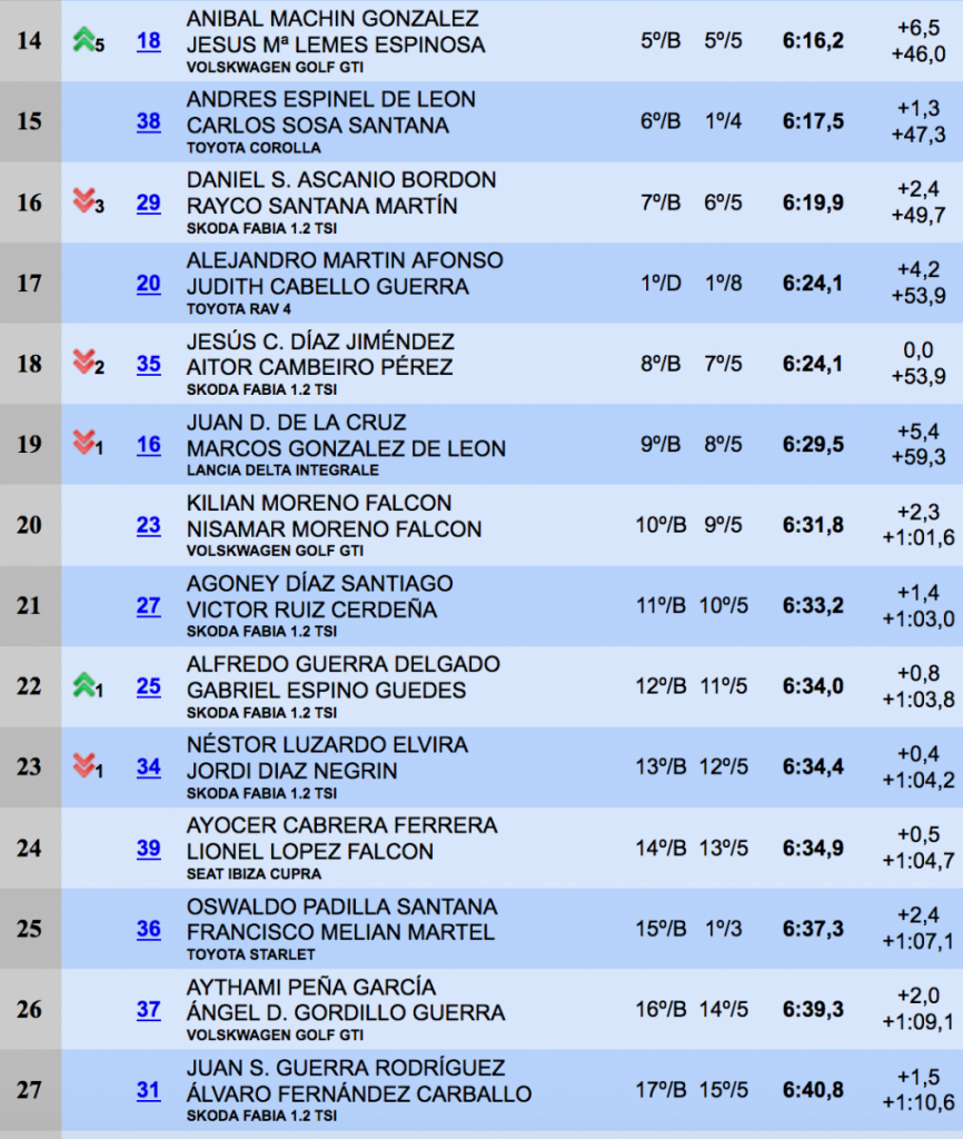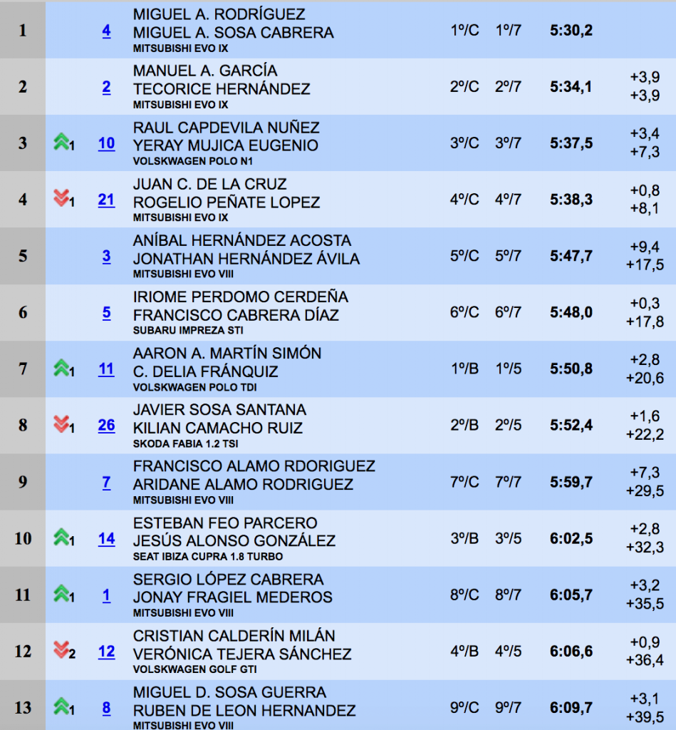 En quinto lugar están Aníbal Hernández y Jonathan Hernández (Mitsubishi Lancer Evo VIII), a sólo 0.3 de Iriome Perdomo y Francisco Cabrera (Subaru Impreza STI).