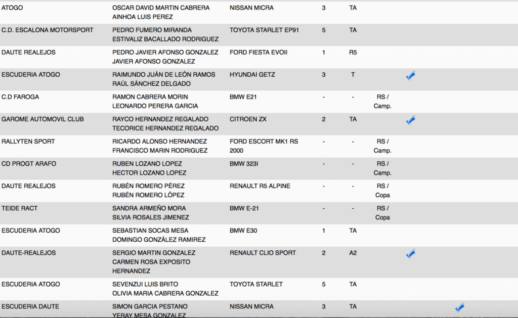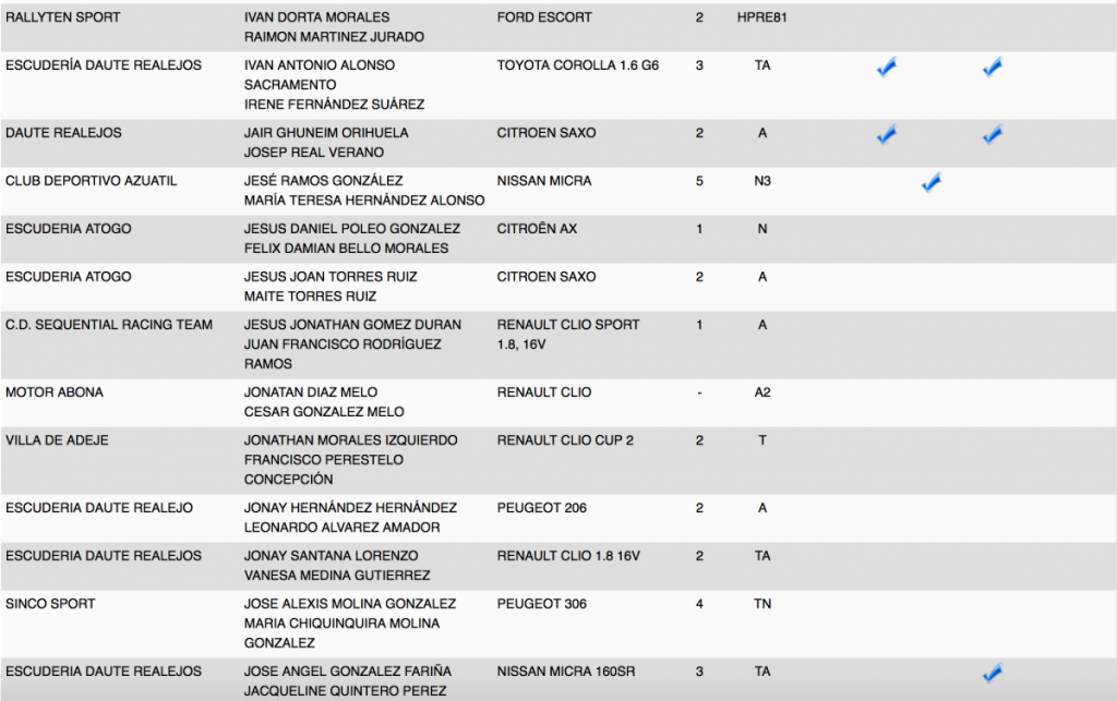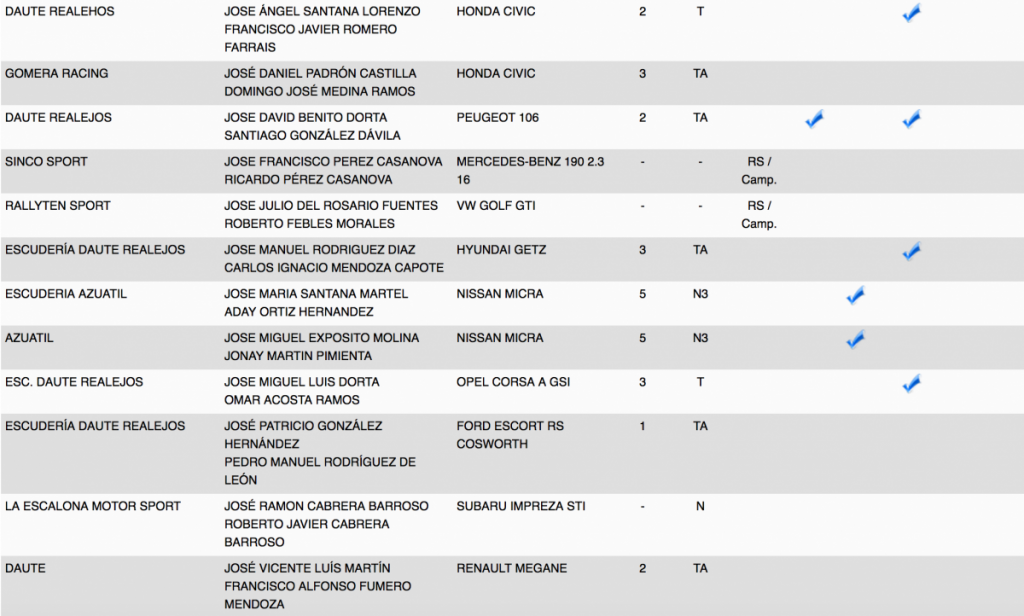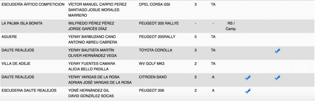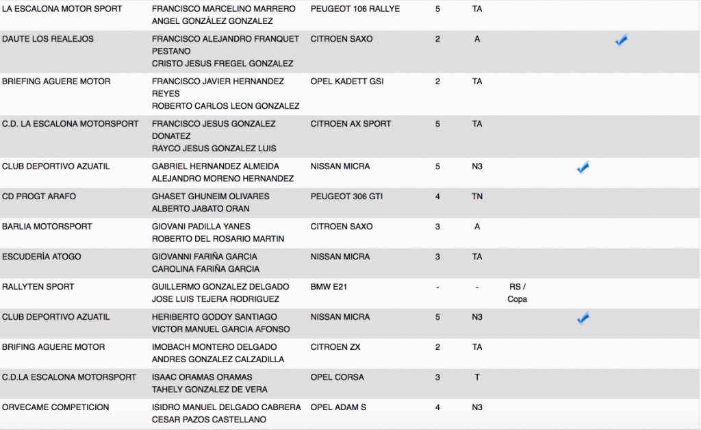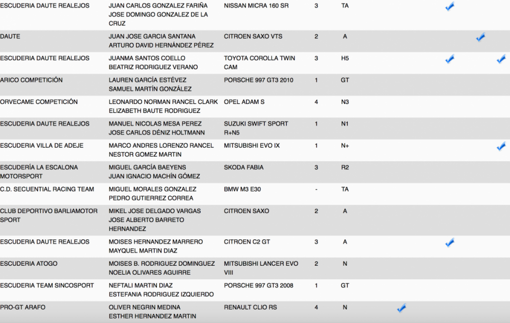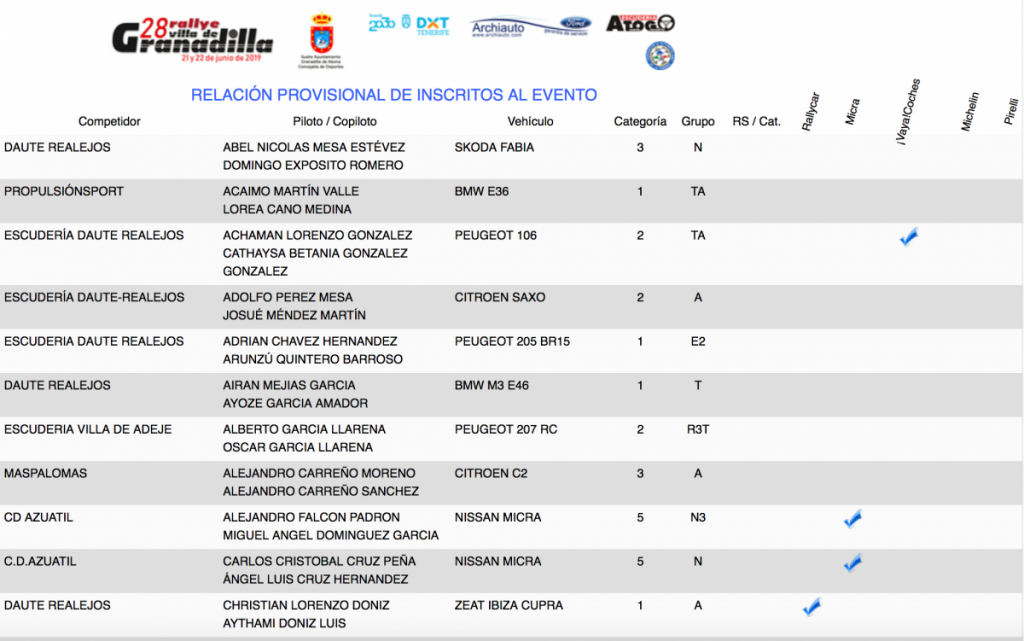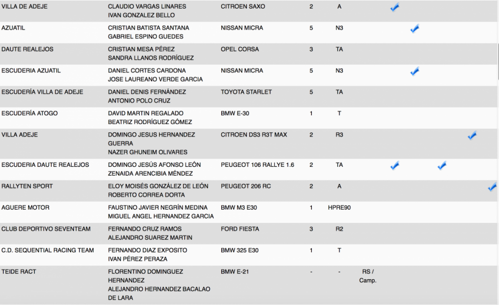 Publicamos la relación de equipos inscritos en el 28º Rallye Villa Histórica de Granadilla de Abona (Tenerife).