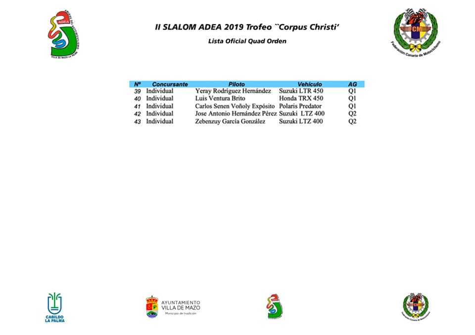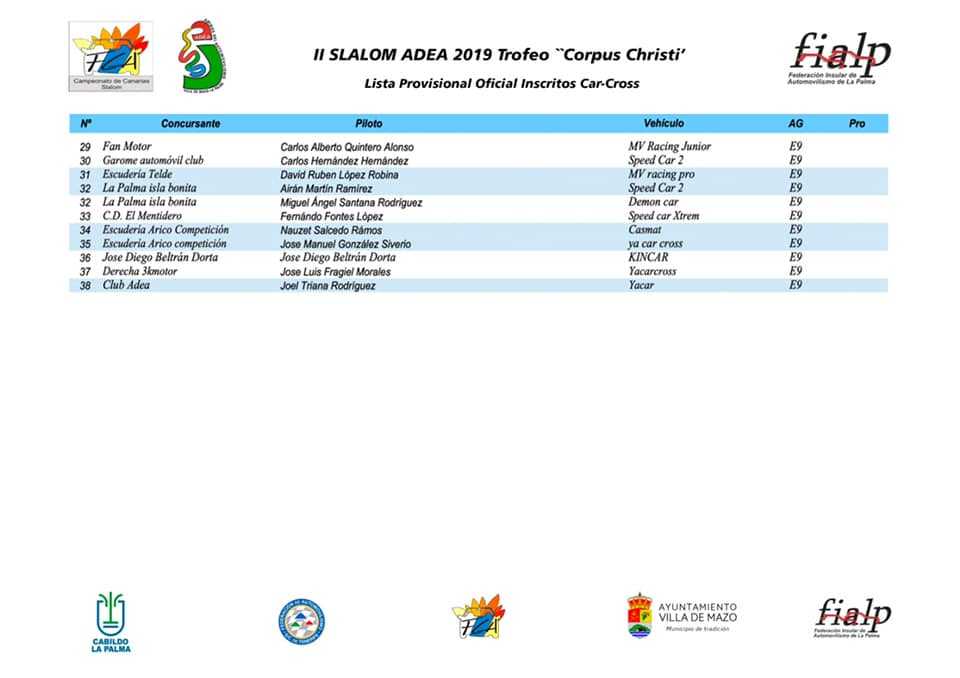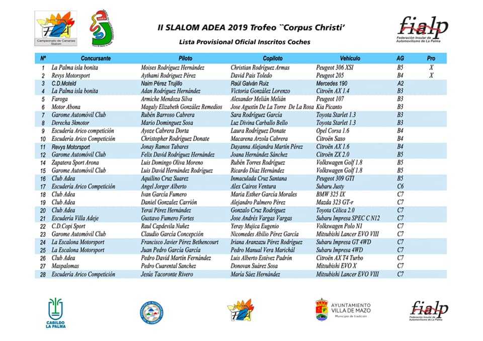 Publicamos la lista oficial de inscritos Del II Slalom Adea 2019 Trofeo Corpus Christi, cita puntuable para el Campeonato Autonómico de Canarias de Slaloms, Provincial de Tenerife e Insular de La Palma.