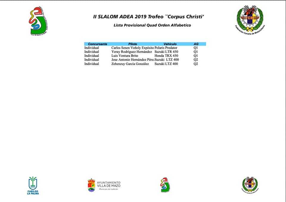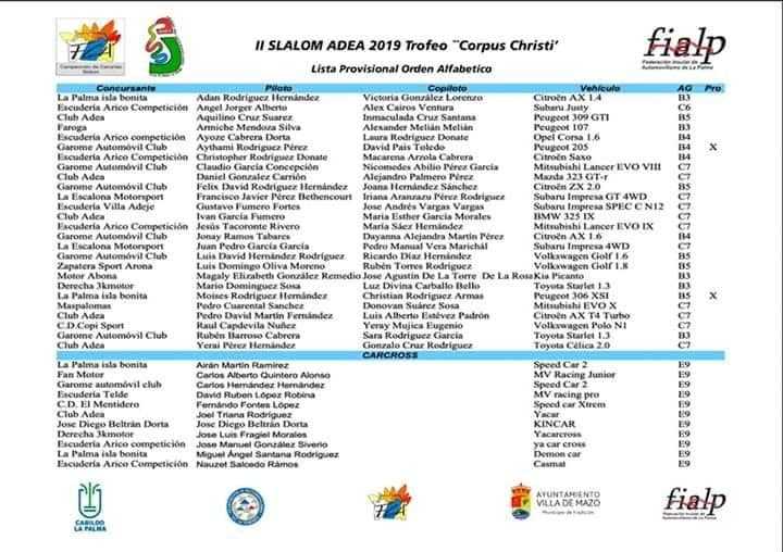 Publicamos las listas provisionales para el II Slalom Adea Trofeo Corpus Christi 2019, cita del Campeonato de Canarias de Slaloms que se disputará este fin de semana en la isla de La Palma.