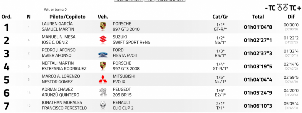 Si los cronos de la noche del viernes invitaban al optimismo de cara a una estrecha lucha por la victoria después de la disputada de la especiales ‘Río-Chimiche’ (9,90 km) y ‘Atogo-Charco del Pino’ (8,10 km), desde que se hizo de día y arrancaron las especiales del sábado, dos pasadas por ‘Arico’ (7,50 km), ‘Cisnera-Granadilla’ (11,20 km), ‘Martela-Frontón’ (16,10 km) y ‘Atogo’ (6,50 km), los tinerfeños Lauren García y Samuel Martín (Porsche 997 GT3 2010) no dejaron lugar a dudas y tras ser los más rápidos en las 10 especiales, se llevaron la victoria en el Rally Villa de Granadilla, cita del Campeonato Provincial e Insular de Tenerife de Rallys.